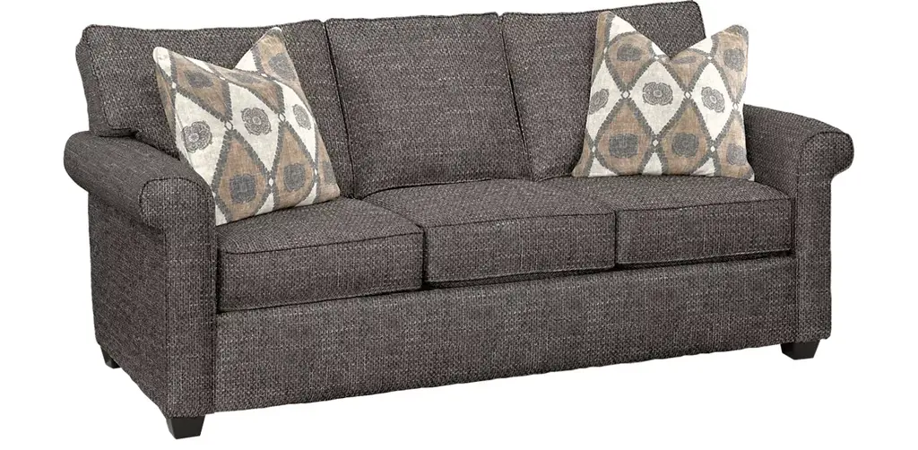 Inspired by the past but rooted firmly in the present, this queen sofa sleeper complements your transitional seating area. Its versatile upholstery is delightfully detailed for a subtle herringbone effect. Designer touches like decorative nailhead trim and bun legs add traditional character. A handy pull-out mattress brings must-have function. With this sofa sleeper's reliable style and comfort, all you need to do is sit back and relax.