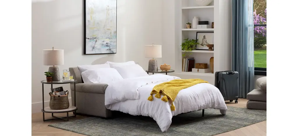 You simply can't go wrong with the classic roll arm silhouette and patented, unparalleled sleep comfort of the Gaines sleeper sofa from American Leather. Featuring 80" of true sleeping space on a 5" plush, high-density foam mattress, it's also a big solution for smaller spaces. This sleeper requires zero wall clearance and can be disassembled to fit through narrow spaces.