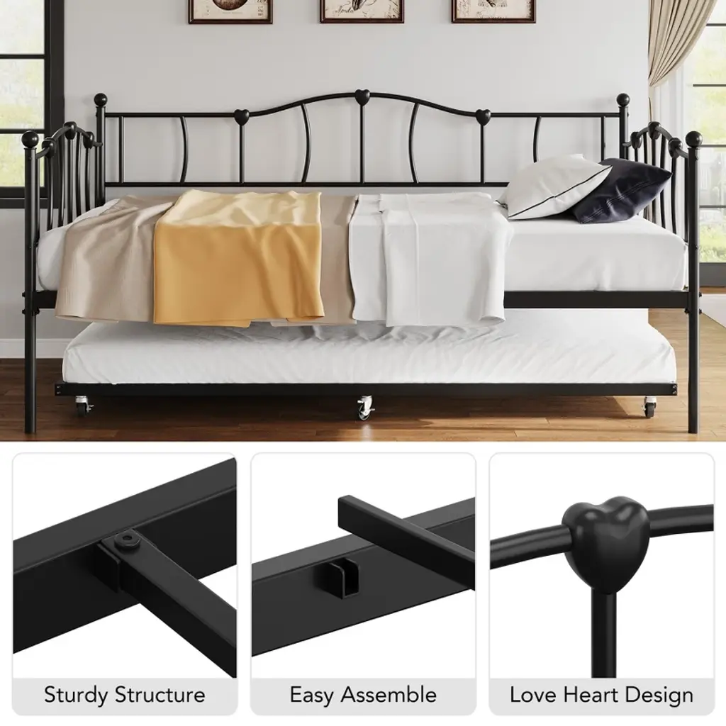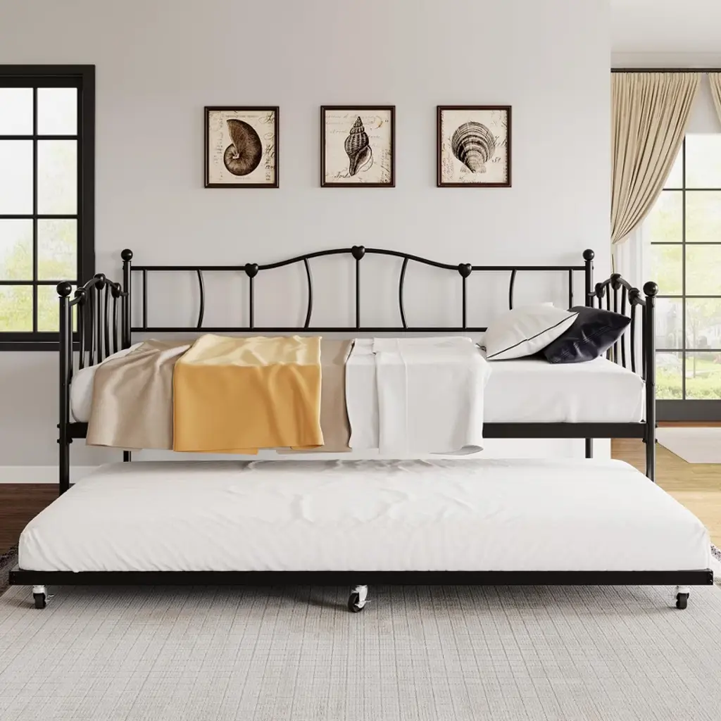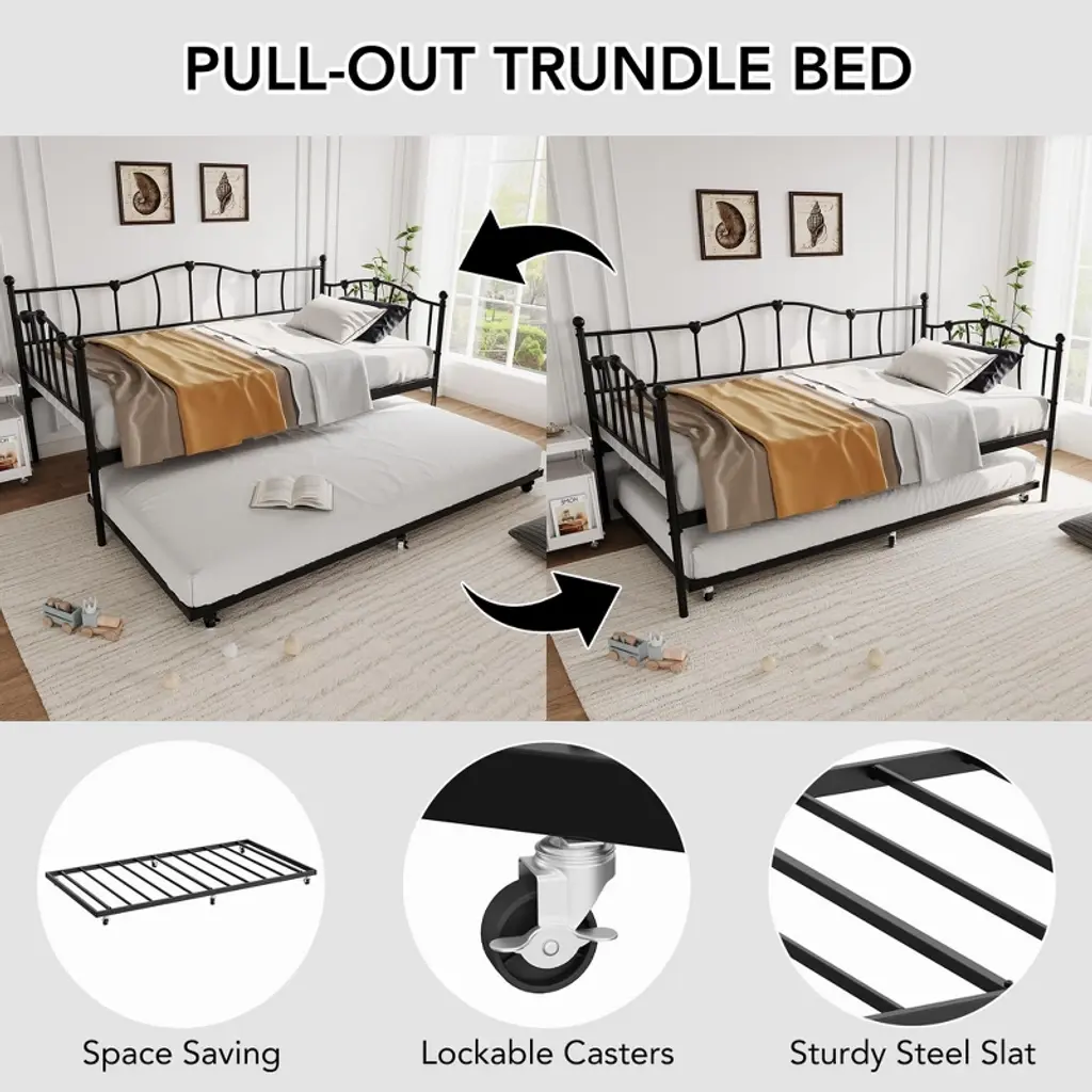 Garvee Twin Metal Daybed With Trundle, No Box Spring Needed, Steel Frame & Headboard, Space-saving Sleeper Sofa For Bedroom, Living Room, Black
