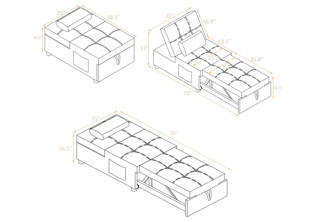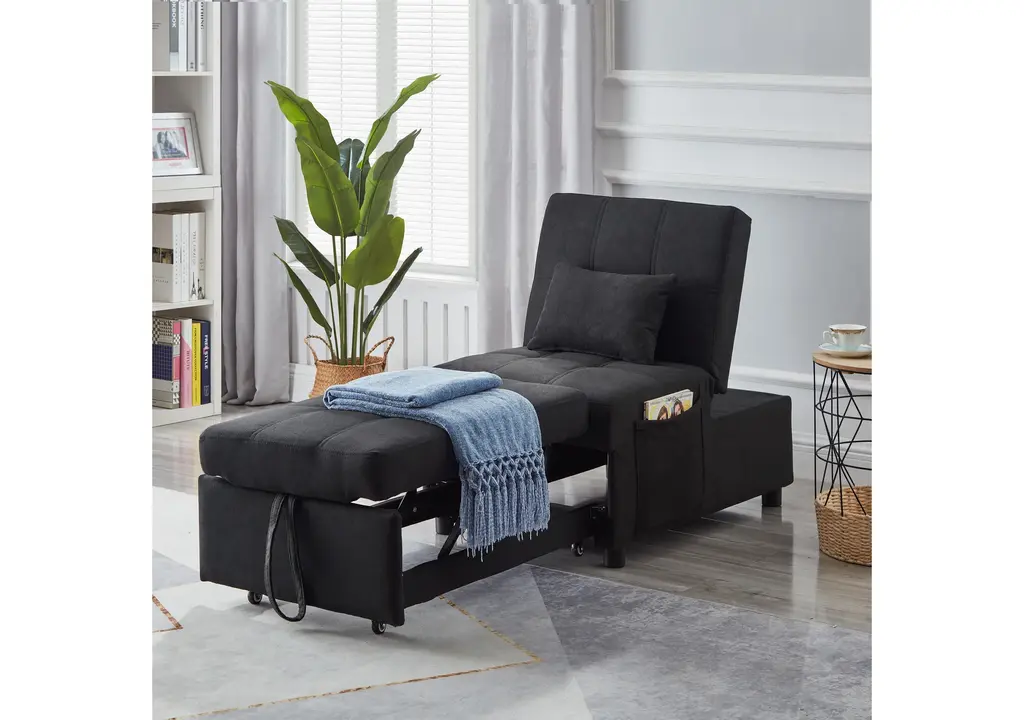 Convertible Versatility: This recliner chair bed is designed to meet a variety of needs in your home, easily transforming into a bed, lounge chair, or ottoman. It features three adjustable backrest angles, allowing you to customize your comfort whether you're relaxing, reading, or sleeping. Its multifunctional design makes it an ideal addition to any living room or bedroom, offering practical solutions for both everyday lounging and hosting guests.Premium Material Selection: Experience superior comfort with the chair's high-density sponge filling, providing plush support for sitting or sleeping. The soft and smooth linen fabric upholstery adds a touch of elegance and coziness to any room. These carefully selected materials ensure not only great comfort but also long-lasting durability, making this chair bed a wise investment for your home.Sturdy and Stable Construction: Built with a robust wood and metal frame, this chair bed is designed to support up to 300 lbs with ease. The durable construction ensures stability and longevity, while strict quality control measures guarantee reliability and safety.Compact Size for Space Optimization: When used as an ottoman, this chair measures 38.5 x 25 x 16.5 inches, making it a compact and stylish piece that fits seamlessly into small spaces. Fully unfolded as a bed, it extends to 70 x 25 x 31 inches, providing ample space for comfortable sleep. Weighing just 62.7 lbs, it is easy to move and adjust according to your room's layout, maximizing functionality without sacrificing style.Effortless Assembly: Setting up this versatile chair bed is straightforward and hassle-free. Simply attach the wheels and legs, and secure the frame into the bottom position, and you'll have a fully ready multi-functional lounge bed.Include: One (1) Sleeper ChairMaterial: 100% Polyester + Eucalyptus + MetalColor: Multiple OptionsAssembly RequiredDimensions: 25.00 inches deep x 38.50-70.00 inches wide x 16.50-31.00 inches high