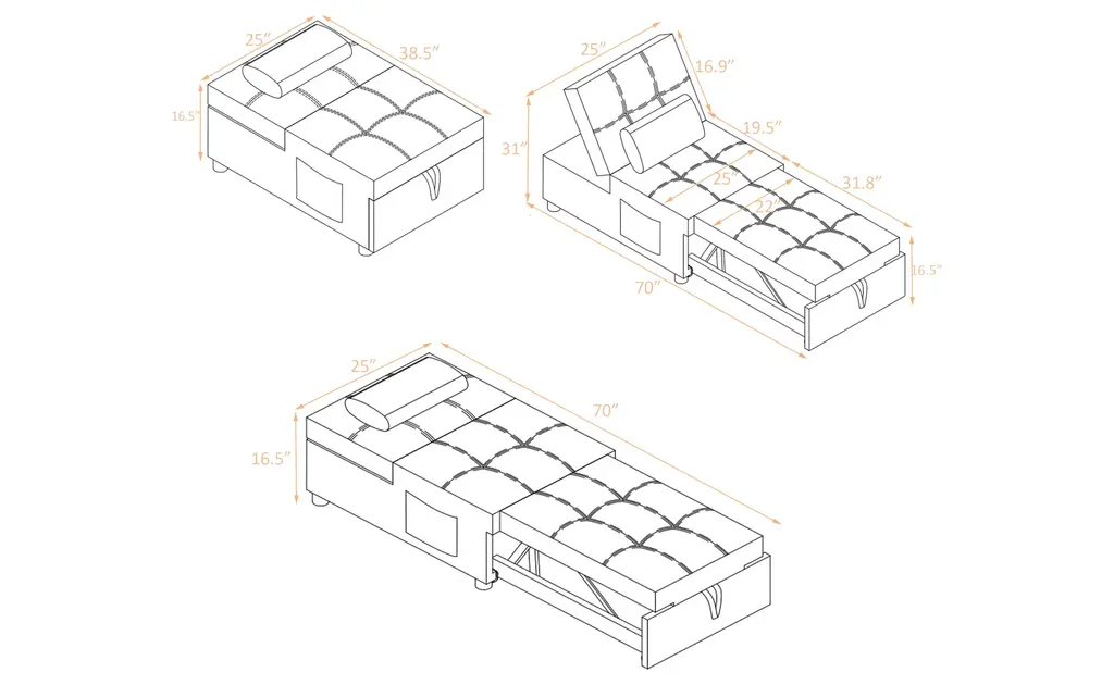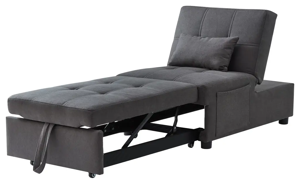 Convertible Versatility: This recliner chair bed is designed to meet a variety of needs in your home, easily transforming into a bed, lounge chair, or ottoman. It features three adjustable backrest angles, allowing you to customize your comfort whether you're relaxing, reading, or sleeping. Its multifunctional design makes it an ideal addition to any living room or bedroom, offering practical solutions for both everyday lounging and hosting guests.Premium Material Selection: Experience superior comfort with the chair's high-density sponge filling, providing plush support for sitting or sleeping. The soft and smooth linen fabric upholstery adds a touch of elegance and coziness to any room. These carefully selected materials ensure not only great comfort but also long-lasting durability, making this chair bed a wise investment for your home.Sturdy and Stable Construction: Built with a robust wood and metal frame, this chair bed is designed to support up to 300 lbs with ease. The durable construction ensures stability and longevity, while strict quality control measures guarantee reliability and safety.Compact Size for Space Optimization: When used as an ottoman, this chair measures 38.5 x 25 x 16.5 inches, making it a compact and stylish piece that fits seamlessly into small spaces. Fully unfolded as a bed, it extends to 70 x 25 x 31 inches, providing ample space for comfortable sleep. Weighing just 62.7 lbs, it is easy to move and adjust according to your room's layout, maximizing functionality without sacrificing style.Effortless Assembly: Setting up this versatile chair bed is straightforward and hassle-free. Simply attach the wheels and legs, and secure the frame into the bottom position, and you'll have a fully ready multi-functional lounge bed.Include: One (1) Sleeper ChairMaterial: 100% Polyester + Eucalyptus + MetalColor: Multiple OptionsAssembly RequiredDimensions: 25.00 inches deep x 38.50-70.00 inches wide x 16.50-31.00 inches high