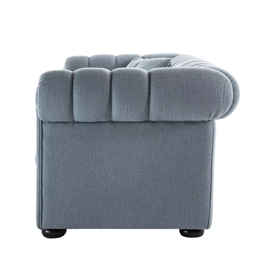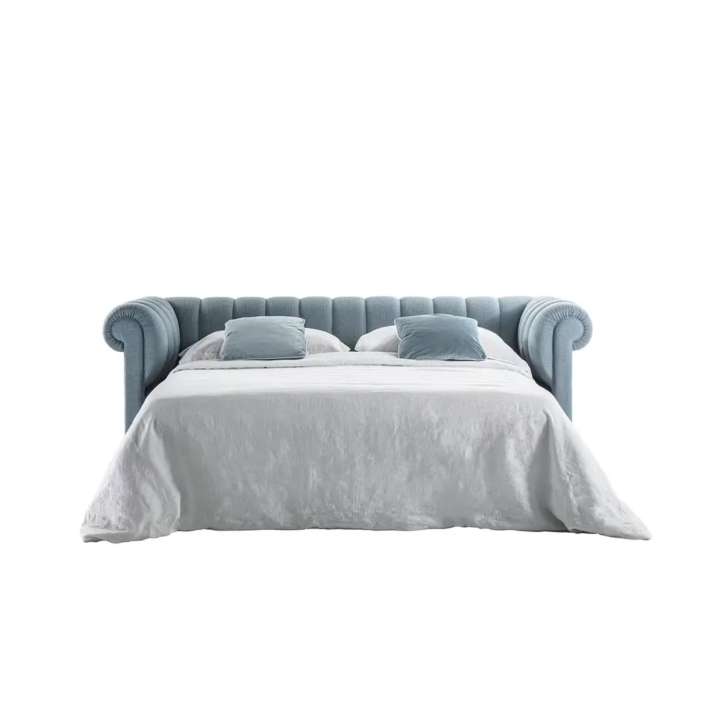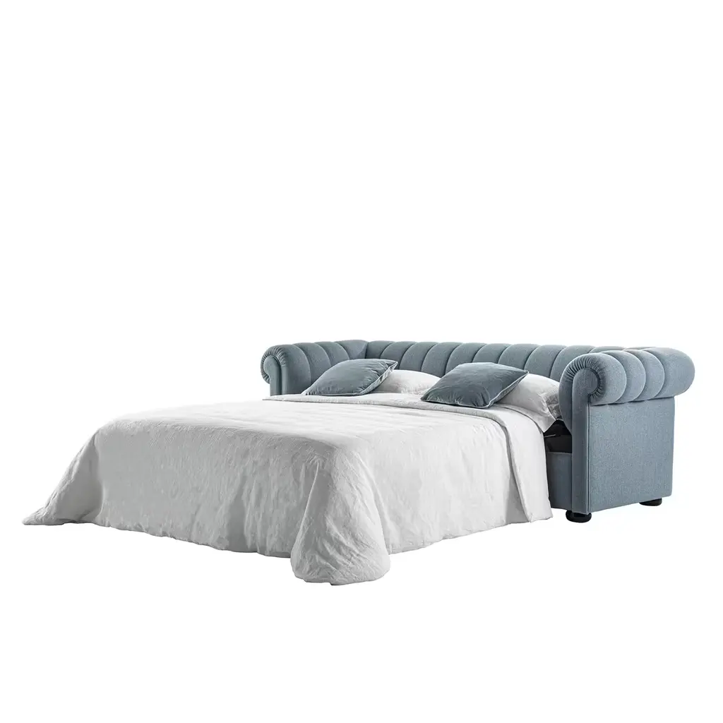 This sofa bed exemplifies its personal interpretation key of classic furniture. The solid walnut frame is generously padded with multi-density polyurethane foam and upholstered in soft gray fabric, the backrest enlivened by an exquisite quilted design of vertical channels ending in a volute-like profile. Inside are housed an extractable slat base and a mattress (H 155x185x8cm). Please ask the Concierge for variants and available customizations.