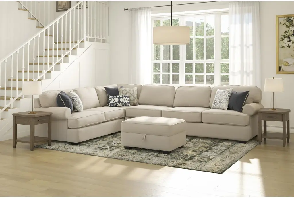 Introducing the Hampstead II Linen 140" 2 Piece Sectional with Right Arm Facing Queen Sleeper Sofa & Ottoman. This casual sectional in a neutral linen color offers both style and functionality for your living room. It features loose reversible back cushions, ensuring comfort and versatility for any seating arrangement.