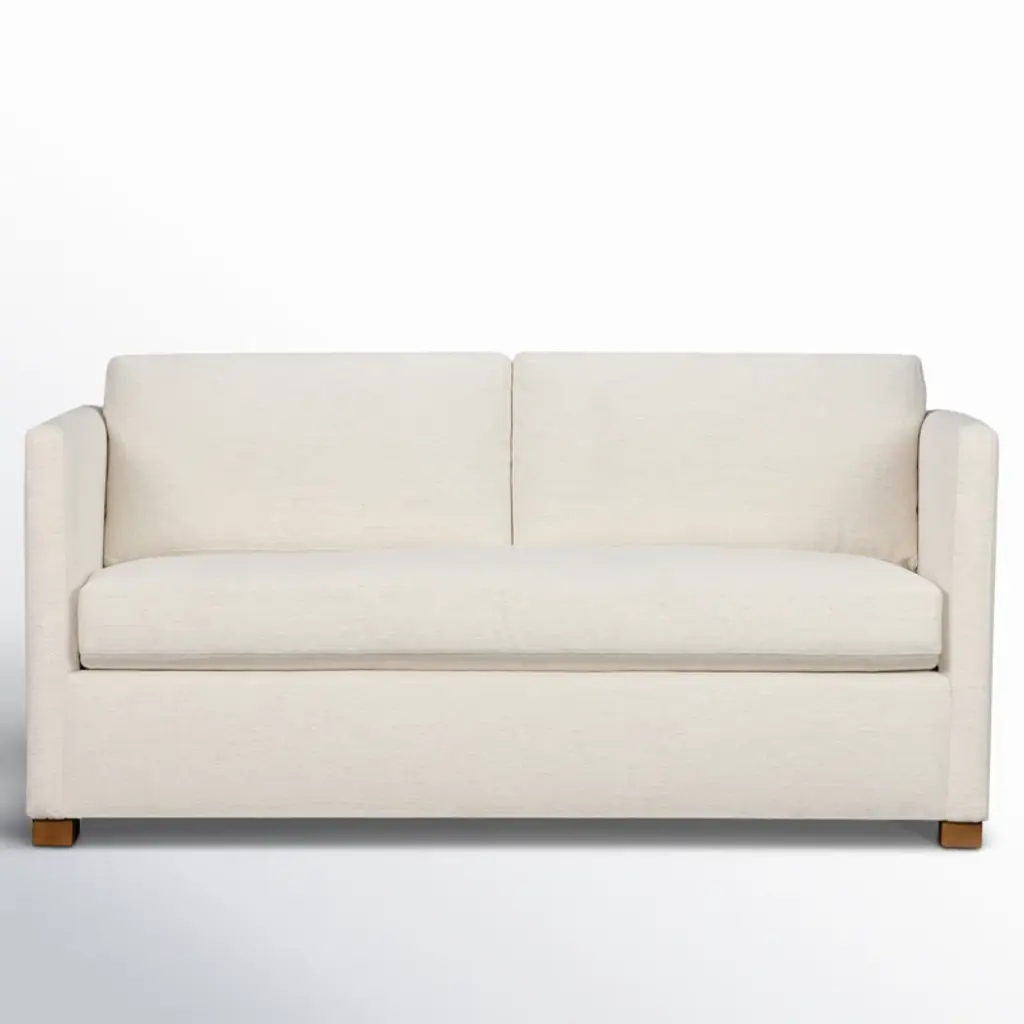 If there was ever a sexy sofa, it would be this one. Classic lines that never go out of style and a solid wood base with a pecan finish completes this sleek modern look. Speaking of sleek, give yourself an extra spritz of eau de parfum tonight on the way out because this puppy folds out into a sleeper mattress built for deux. That's right - sophisticated sofa by day, comfortable full-size sleeper sofa bed by night. It features a deluxe 4.5-inch thick memory foam mattress for a luxurious slumber. This apartment-sized sleeper sofa bed is just the right size for your living room and can comfortably sleep two. So forget about the futon left over from your college dorm room and throw those sleeping bags into storage. Upgrade to this classy sleeper sofa bed for a modern addition to your apartment. Our Harper apartment-sized sleeper sofa bed is custom made with your choice of color and fabric. We're more than happy to send you free fabric swatches to help you decide on the best color for your apartment.