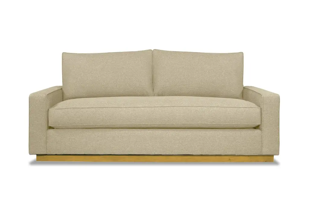 If there was ever a sexy sofa, it would be this one. Classic lines that never go out of style and a solid wood base with a pecan finish completes this sleek modern look. Speaking of sleek, give yourself an extra spritz of eau de parfum tonight on the way out because this puppy folds out into a sleeper mattress built for deux. That's right - sophisticated sofa by day, comfortable twin-size sleeper sofa bed by night. It features a deluxe 4.5-inch thick innerspring mattress for a luxurious slumber. This twin-sized sleeper sofa bed is just the right size for your living room and can comfortably sleep one. So forget about the futon left over from your college dorm room and throw those sleeping bags into storage. Upgrade to this classy sleeper sofa bed for a modern addition to your apartment. Our Harper twin-sized sleeper sofa bed is custom made with your choice of color and fabric. We're more than happy to send you free fabric swatches to help you decide on the best color for your apartment.