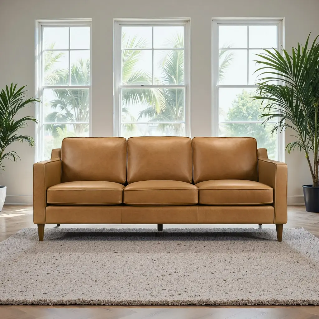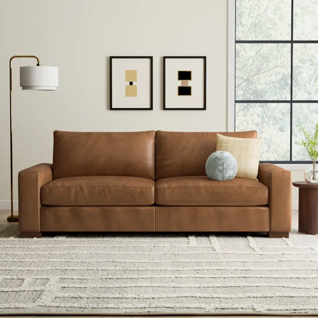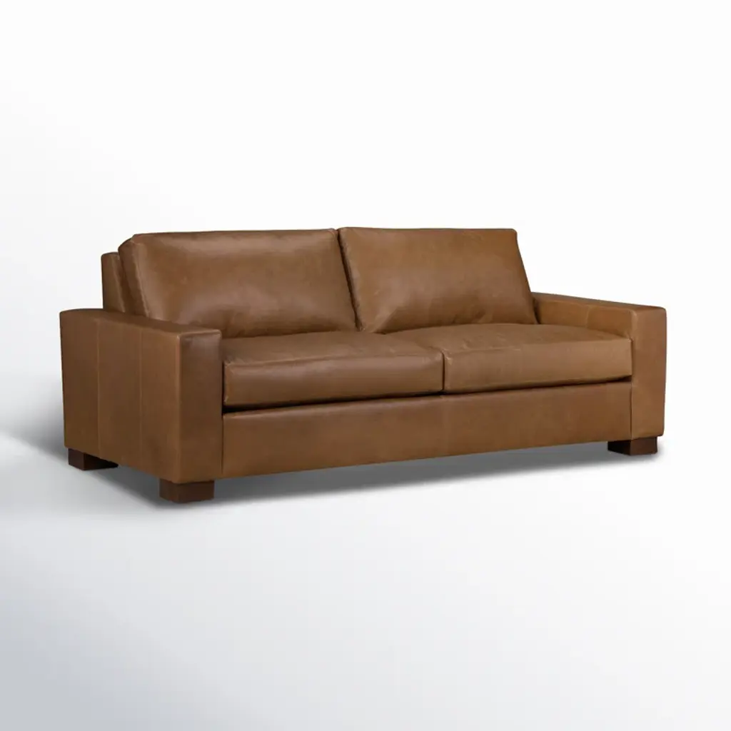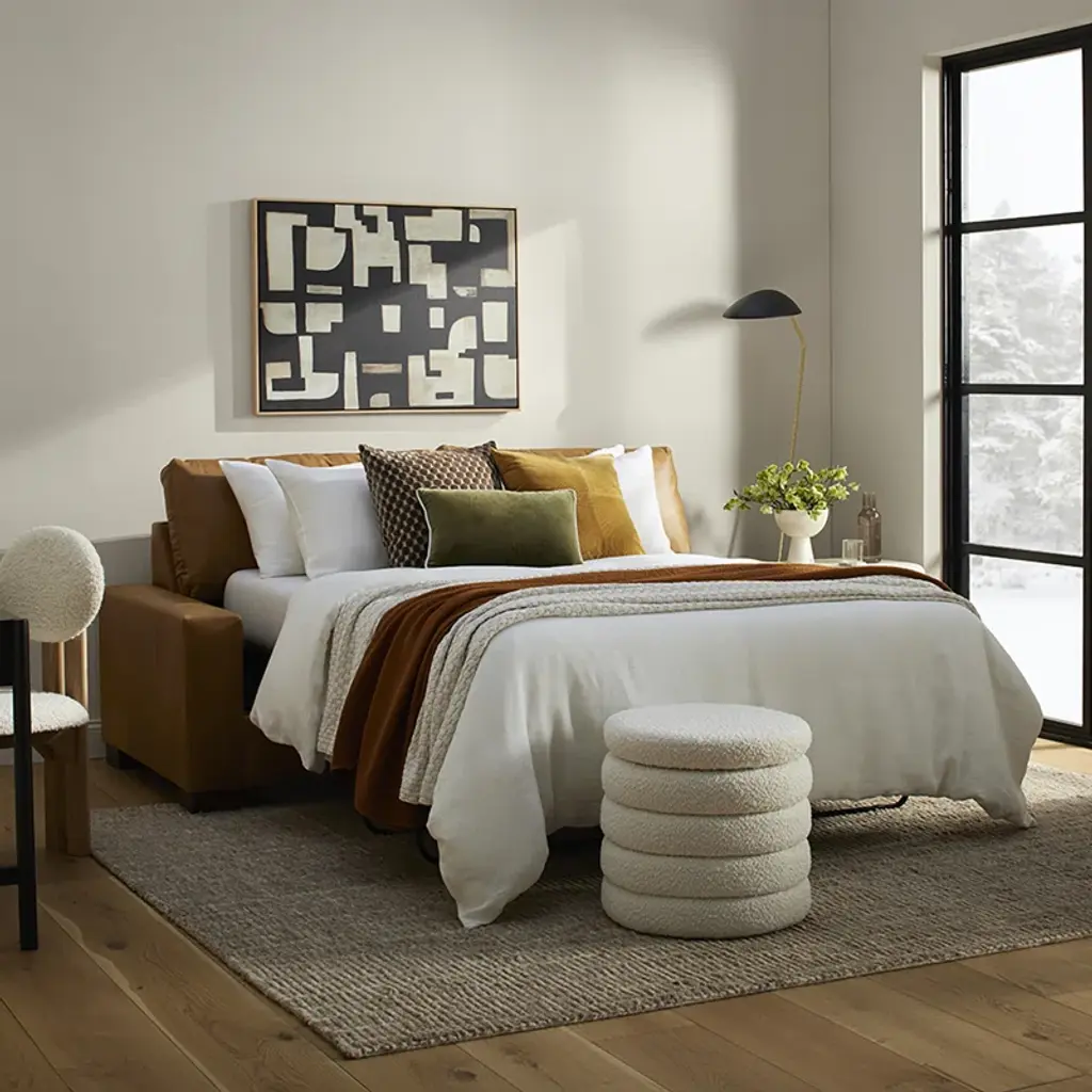 Welcome comfort paired with classic design. Our sleeper sofa updates your living space with a vintage-inspired vibe. And it transforms into a queen bed, complete with a memory-foam mattress, when you have guests. The wooden frame is wrapped in genuine leather in a hue of your choice. Foam and feather padding over sinuous springs provides ample support.