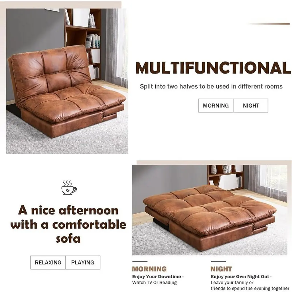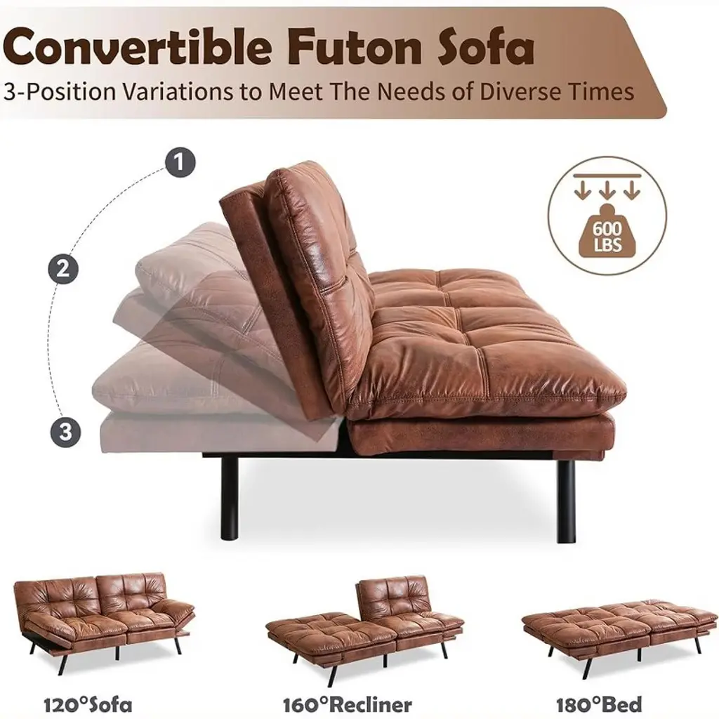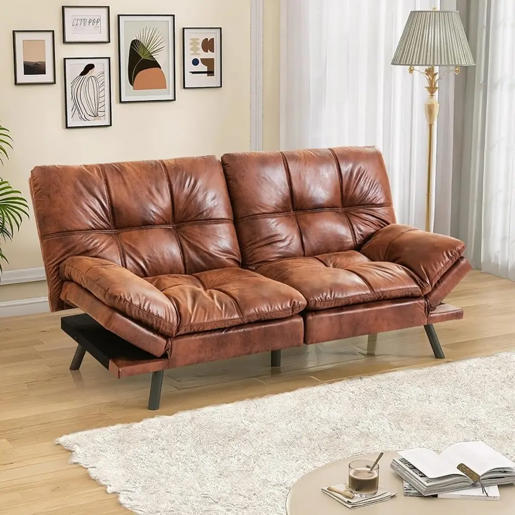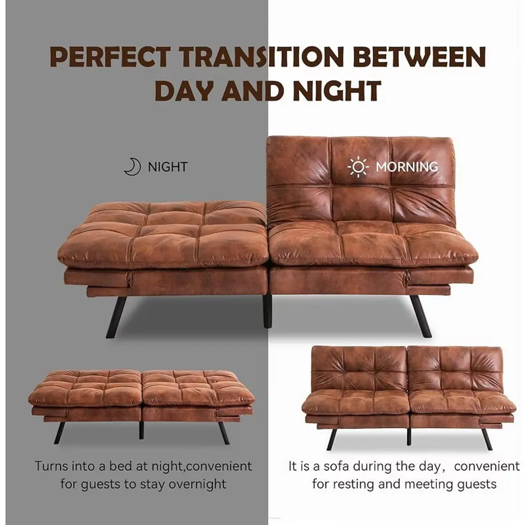 This versatile folding futon sofa is suitable for small spaces and can be easily converted between a sofa and a sleeper bed. The split backrest design provides 3 levels of adjustable angles to meet the needs of sitting, lying and lying, half of which can lie flat and half can remain upright. The solid wood structure with six metal legs can bear up to 550 pounds to ensure stability and durability. High-density foam padding and leather cushioning provide excellent comfort for you to enjoy a relaxing experience.