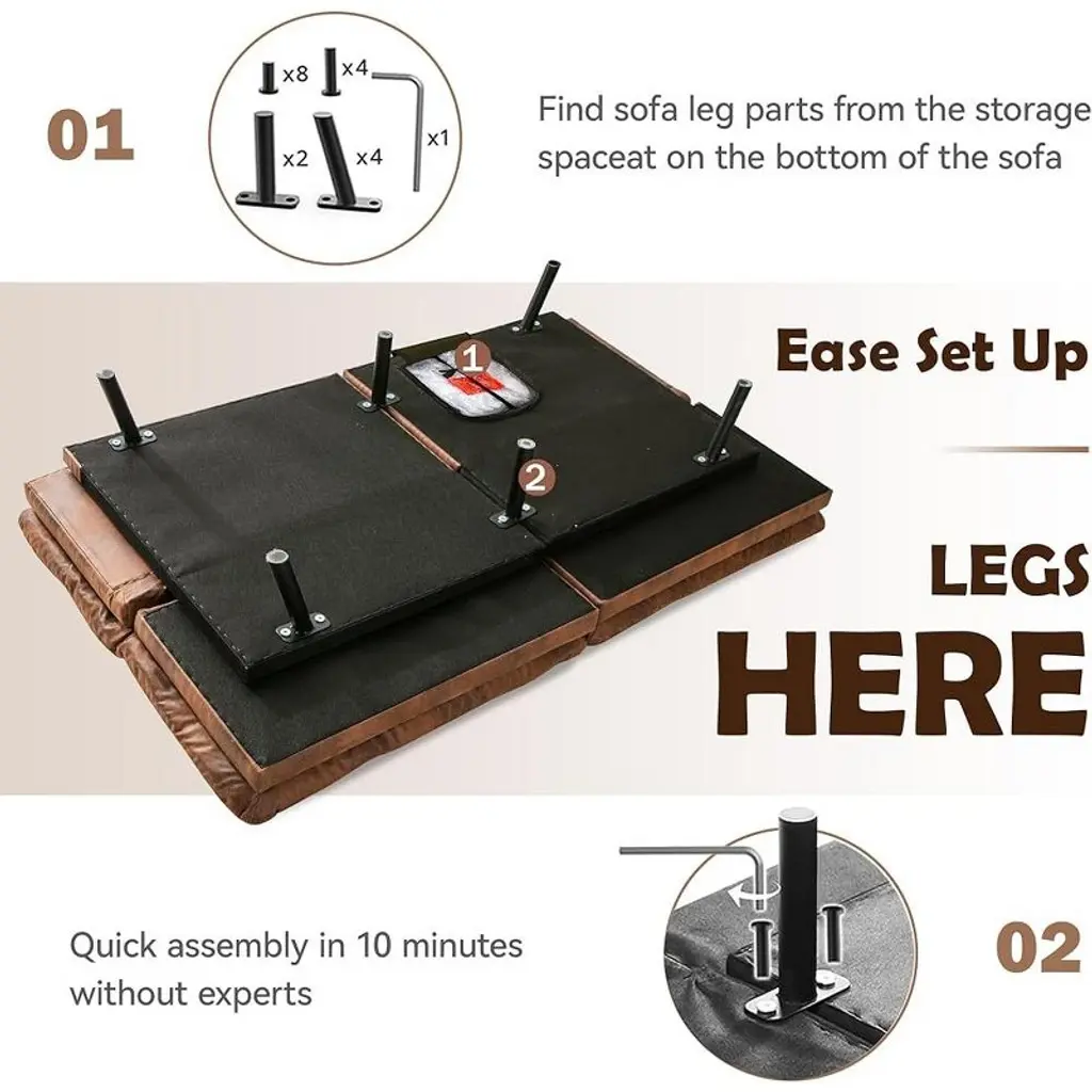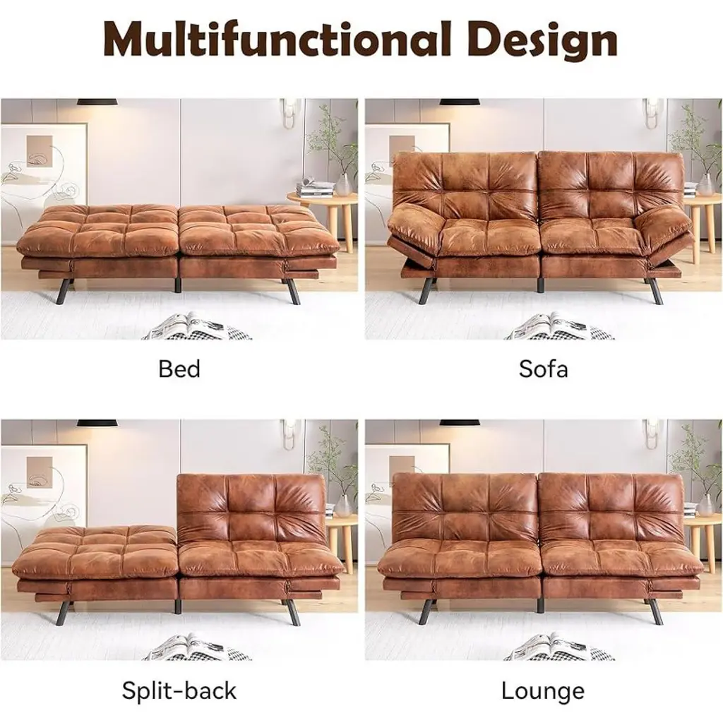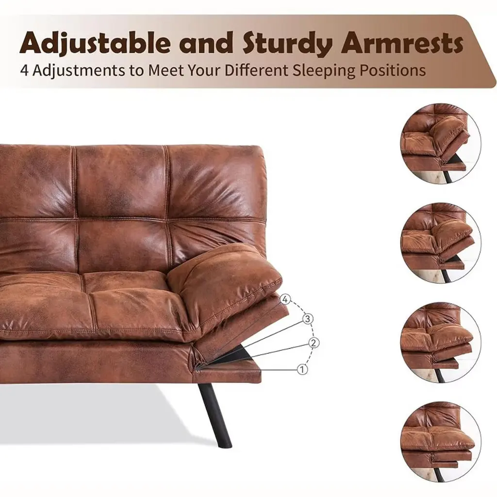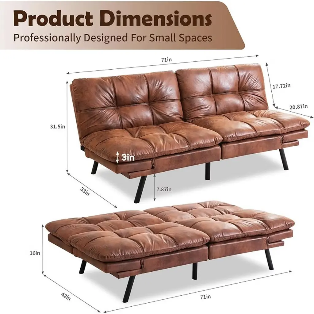 This versatile folding futon sofa is suitable for small spaces and can be easily converted between a sofa and a sleeper bed. The split backrest design provides 3 levels of adjustable angles to meet the needs of sitting, lying and lying, half of which can lie flat and half can remain upright. The solid wood structure with six metal legs can bear up to 550 pounds to ensure stability and durability. High-density foam padding and leather cushioning provide excellent comfort for you to enjoy a relaxing experience.