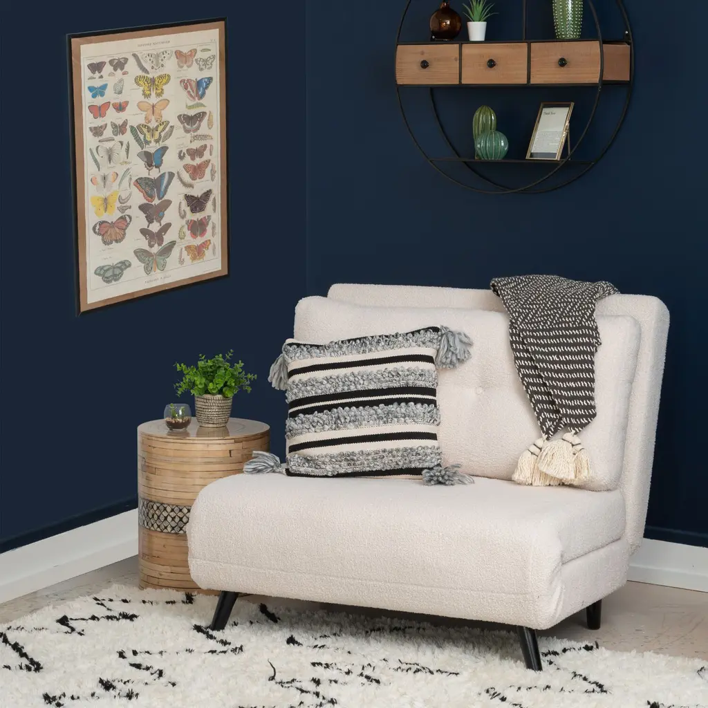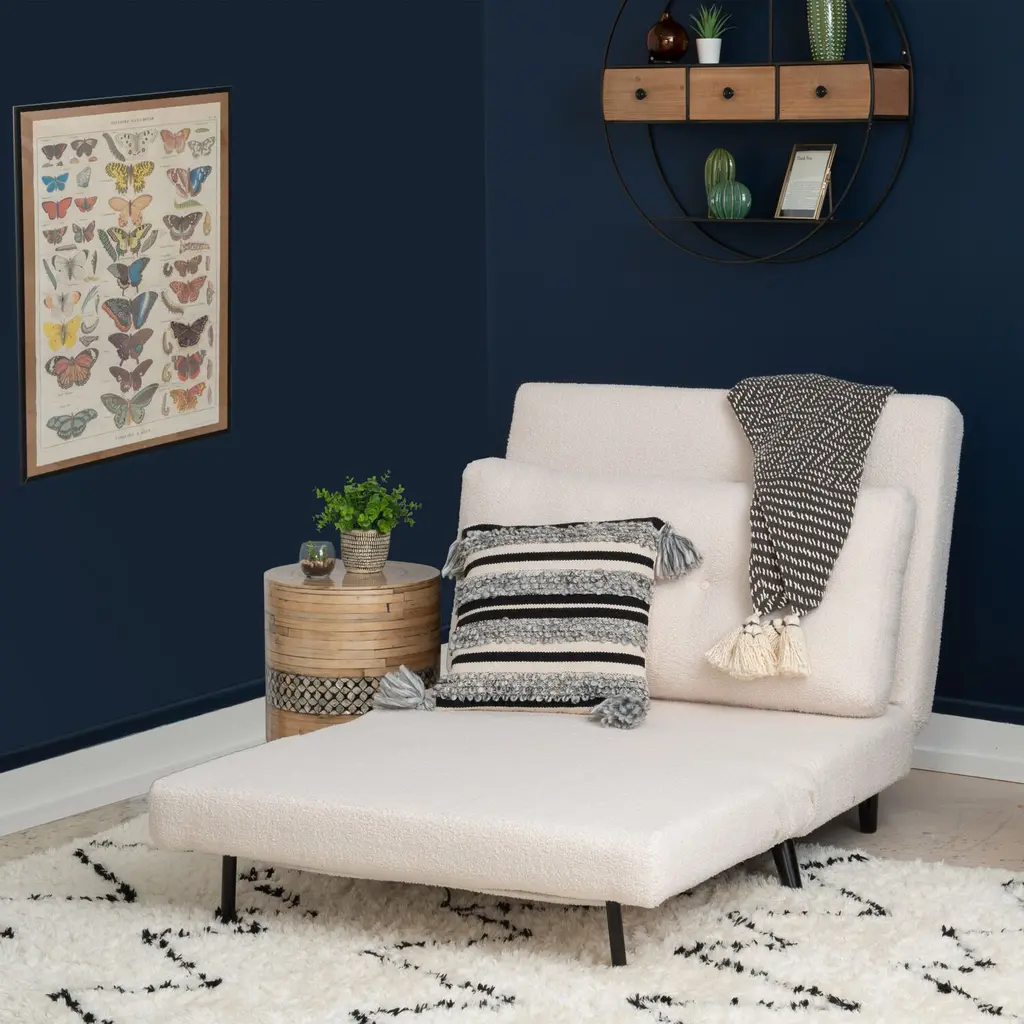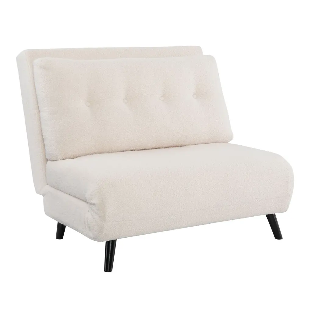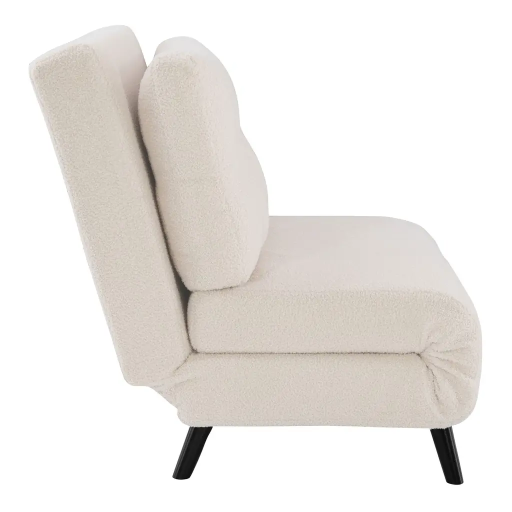 Tailored with plush faux-sherpa upholstery, the off-white Julian sleeper chair reclines into a chaise lounger position or folds flat to become a comfy small bed. Chic and cozy in any of its three positions, this convertible lounge chair features a removable tufted back cushion that doubles as a comfortable bed pillow. A boon for small spaces, it's a prime reclining seat that makes sure you're always ready to accommodate a visiting guest.