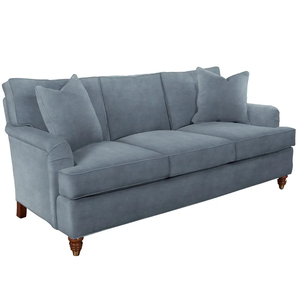 Exclusive to One Kings Lane: This English arm queen sleeper sofa is timeless in design and a beloved classic, featuring beautiful turned wood legs. It is upholstered in Crypton--an eco-friendly high-performance velvet fabric--which repels stains, spills, bacteria, and mold. Two throw pillows included. Constructed of an engineered hardwood-laminate frame, eight-way hand-tied suspension system, and a spring foam cushion with down-proof ticking ensure long-lasting comfort and support. Each piece is handcrafted by skilled artisans in High Point, NC and offers a lifetime warranty on the frame and suspension system and a limited lifetime warranty on the seat cushion.