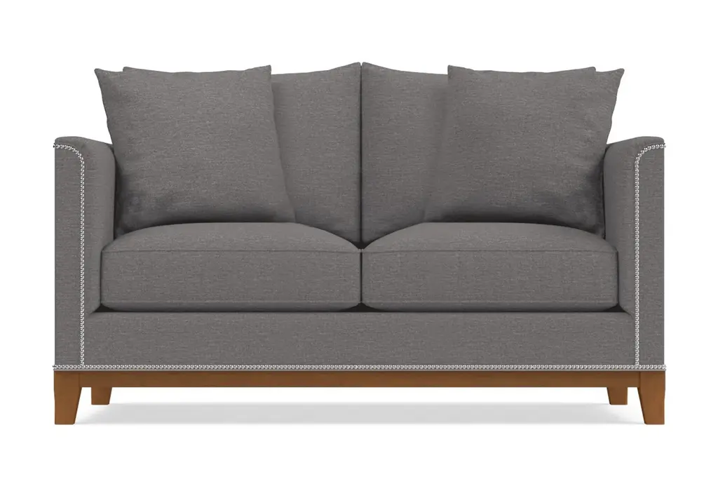 La Brea: the world's most famous tar pits and makers of high-class furniture! The La Brea Sofa Collection is for people who want modern elegance while retaining the best of old world style, and this La Brea studded sleeper sofa bed comes with a Full-size pull out bed making itÊa perfect fit for apartments, condos and other smaller homes. Each sofa is framed with silver nail head studs for the perfect combination of quality and flair, with a choice of fabrics and wooden base finish to tailor it for your taste. The La Brea apartment sofa is made in the U.S. and comes with a limited lifetime warranty and a satisfaction guarantee. Contact us to order or request a free swatch, and we promise your nail head-studded sofa will be tar-free. The La Brea Sofa Collection combines old world style with new world modern elegance. Framed by silver nail head studs and a rich espresso wooden base, the La Brea will make your room look like a million bucks.
