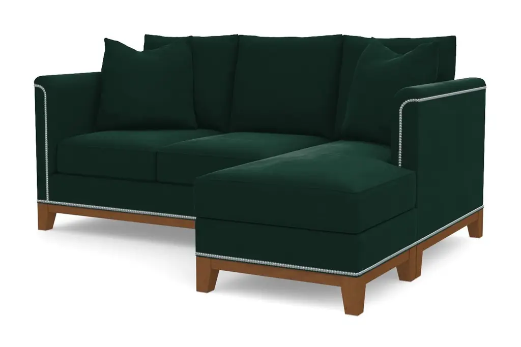 If you're looking for a versatile sofa that exudes elegance and luxurious comfort, the La Brea Reversible Chaise sleeper sofa bed is for you. It looks like it belongs in a villa on the Italian countryside, but we'd much rather see it in your living room. The best part? The chaise works on either side of the couch, giving you more flexibility when designing your space and did we mention it comes with a Queen-sized pull out bed sleeper? Its plush oversized pillows beckon you to relax while the visible silver nail head studs and rich espresso base brings unmatched style to your home or apartment. Available in your choice of fabrics and colors, the La Brea was made in the United States and comes with a limited lifetime warranty. The La Brea Sofa Collection combines old world style with new world modern elegance. Framed by silver nail head studs and a rich espresso wooden base, the La Brea will make your room look like a million bucks.