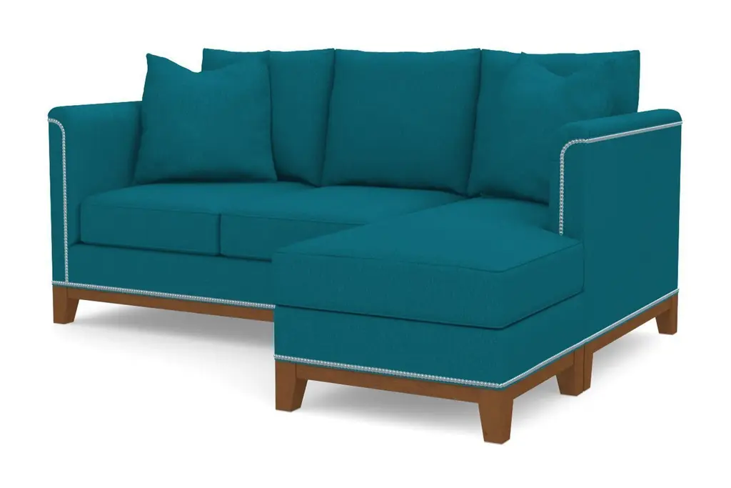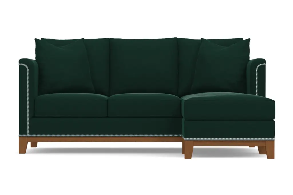 If you're looking for a versatile sofa that exudes elegance and luxurious comfort, the La Brea Reversible Chaise sleeper sofa bed is for you. It looks like it belongs in a villa on the Italian countryside, but we'd much rather see it in your living room. The best part? The chaise works on either side of the couch, giving you more flexibility when designing your space and did we mention it comes with a Queen-sized pull out bed sleeper? Its plush oversized pillows beckon you to relax while the visible silver nail head studs and rich espresso base brings unmatched style to your home or apartment. Available in your choice of fabrics and colors, the La Brea was made in the United States and comes with a limited lifetime warranty. The La Brea Sofa Collection combines old world style with new world modern elegance. Framed by silver nail head studs and a rich espresso wooden base, the La Brea will make your room look like a million bucks.