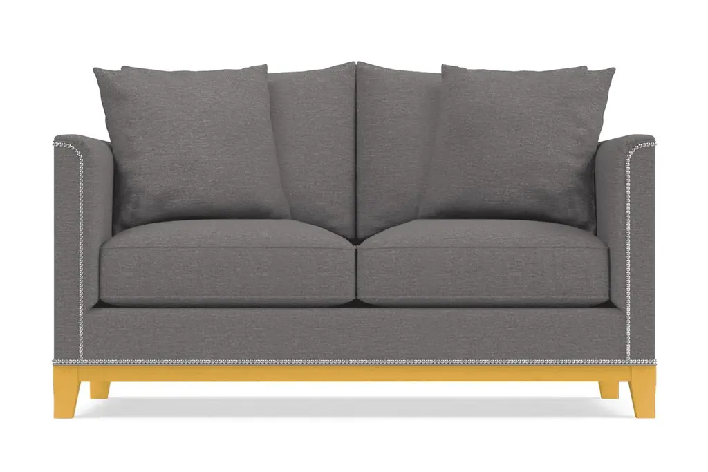 La Brea: the world's most famous tar pits and makers of high-class furniture! The La Brea Sofa Collection is for people who want modern elegance while retaining the best of old world style, and this La Brea studded twin sleeper sofa bed is perfect for apartments, condos and other smaller homes. Each sofa is framed with silver nail head studs for the perfect combination of quality and flair, with a choice of fabrics and wooden base finish to tailor it for your taste. The La Brea twin sleeper sofa bed is made in the U.S. and comes with a limited lifetime warranty and a satisfaction guarantee. Contact us to order or request a free swatch, and we promise your nail head-studded sofa will be tar-free. The La Brea Sofa Collection combines old world style with new world modern elegance. Framed by silver nail head studs and a rich espresso wooden base, the La Brea will make your room look like a million bucks.