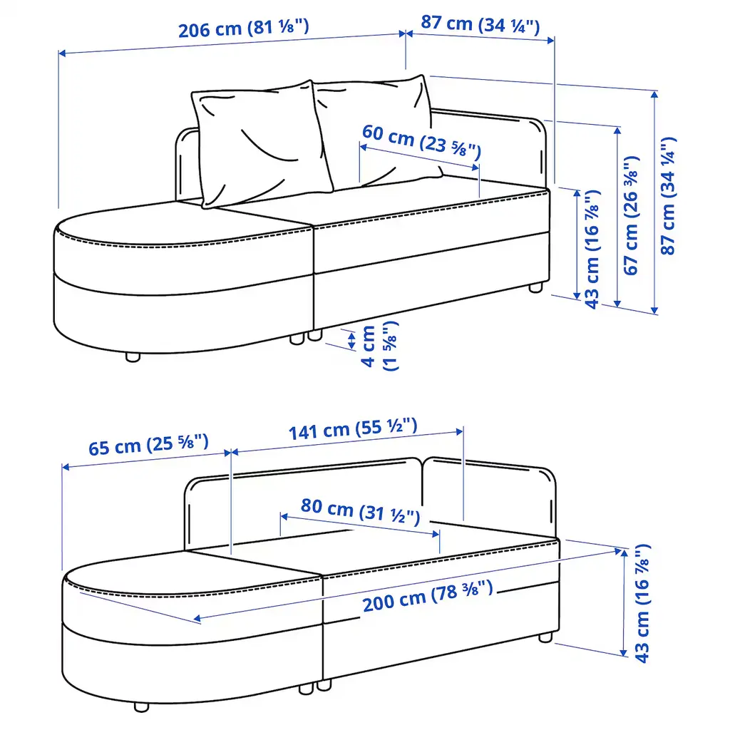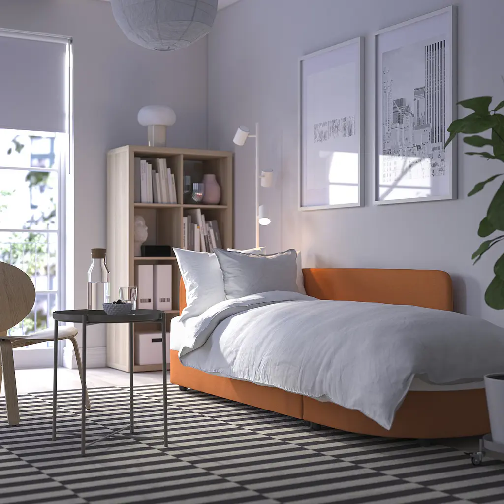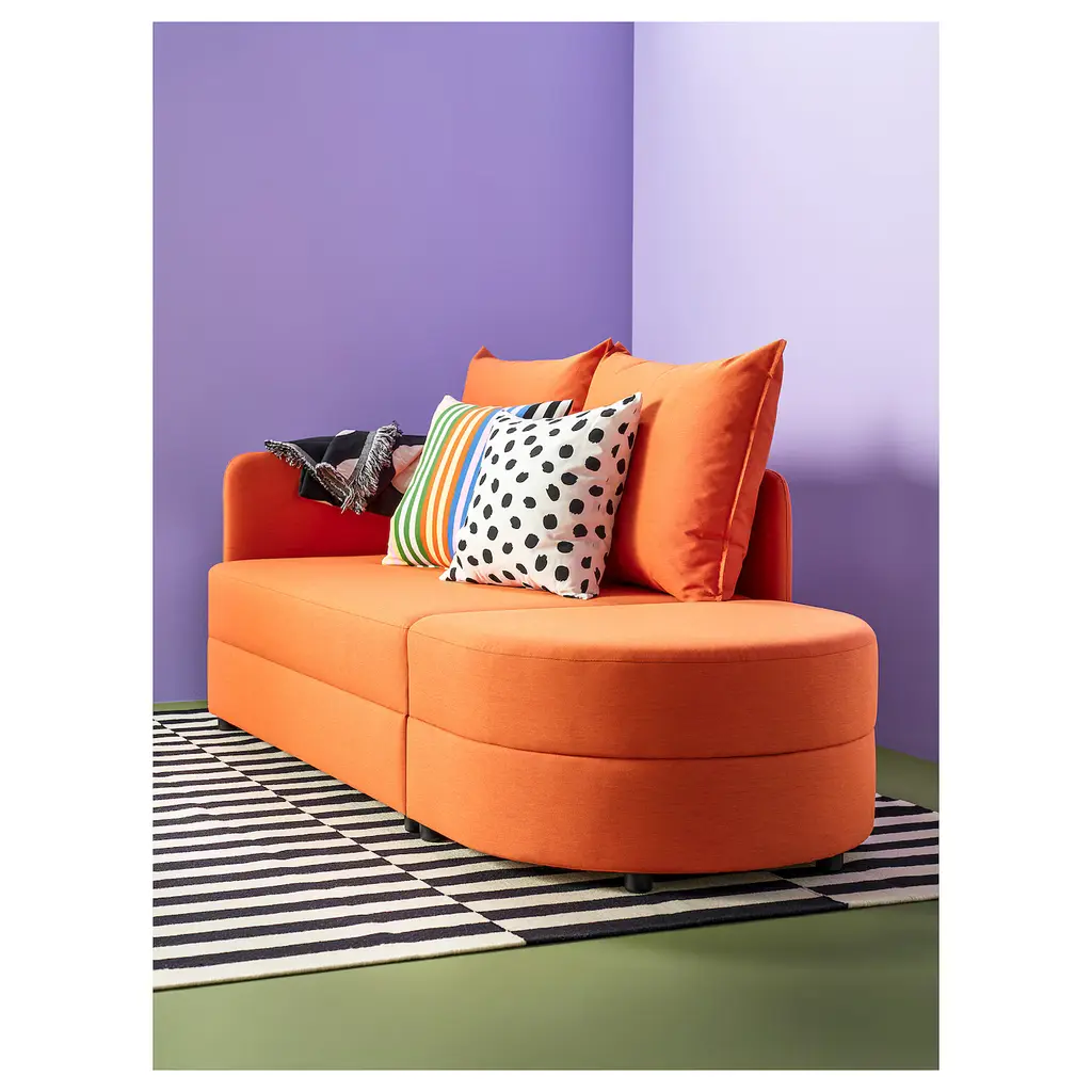 LINDÅKRA Sleeper sofa - Knisa bright orange. This sofa bed has a neat, playful and versatile design with rounded shapes and generously sized back cushions that provide comfort and make it feel inviting. The sofa bed offers practical storage spaces both under the seat section and in the pouffe.