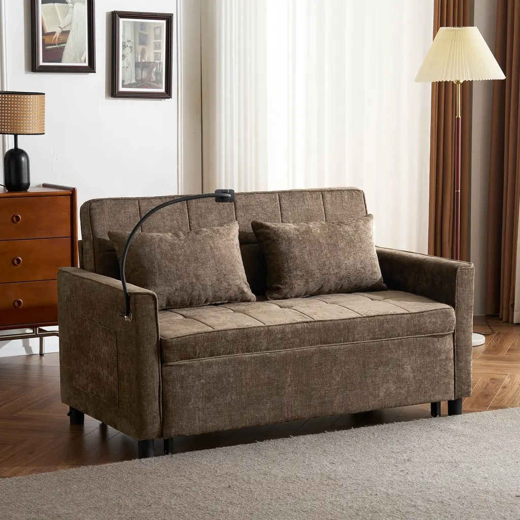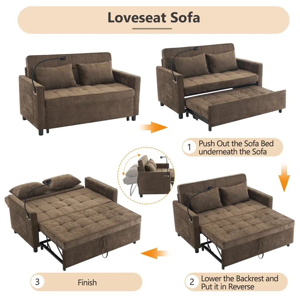 Loveseat Convertible Pull-Out Sleeper Sofa Bed, With Reversible Backrest Cushion 2 Usb Ports And Pockets Sleeper Couch - Brown