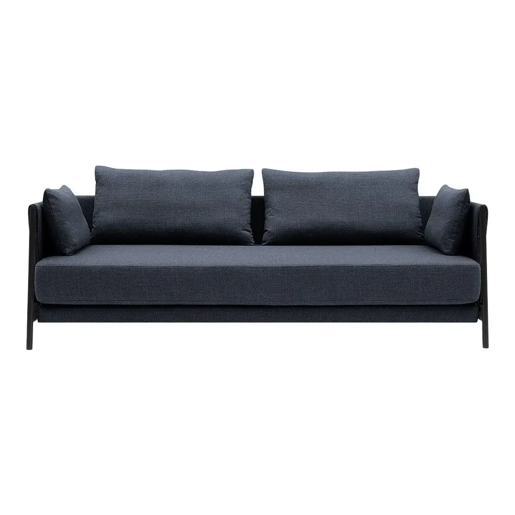This is a young, uncomplicated sofa bed with a casual feeling for sitting, chilling and sleeping. The sofa exudes a casual elegance with its pure fabric-covered steel armrests and the many back cushions with pointed seams. The fabric-covered steel armrests give it its identity and uniqueness. The seat depth of the MADISON sofa invites you to lounge and chill. The pillows, which can be freely arranged, are sometimes used as an armrest, for lumbar support or as a backrest, and there is plenty of space for your personal favorite pillow too. The upper seat cushion can easily be folded forward, and the bed is created.