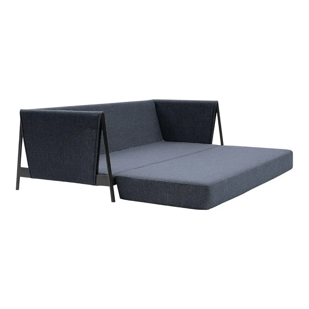 This is a young, uncomplicated sofa bed with a casual feeling for sitting, chilling and sleeping. The sofa exudes a casual elegance with its pure fabric-covered steel armrests and the many back cushions with pointed seams. The fabric-covered steel armrests give it its identity and uniqueness. The seat depth of the MADISON sofa invites you to lounge and chill. The pillows, which can be freely arranged, are sometimes used as an armrest, for lumbar support or as a backrest, and there is plenty of space for your personal favorite pillow too. The upper seat cushion can easily be folded forward, and the bed is created.