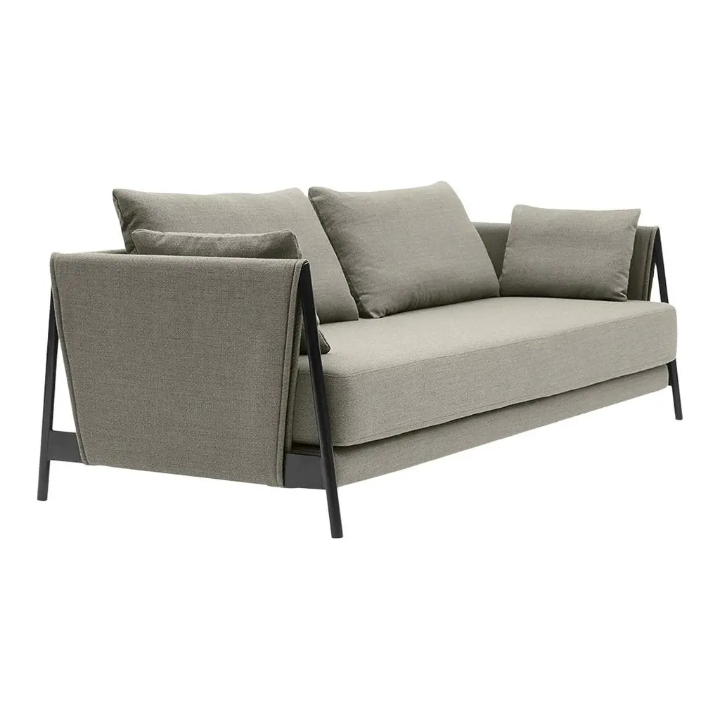 This is a young, uncomplicated sofa bed with a casual feeling for sitting, chilling and sleeping. The sofa exudes a casual elegance with its pure fabric-covered steel armrests and the many back cushions with pointed seams. The fabric-covered steel armrests give it its identity and uniqueness. The seat depth of the MADISON sofa invites you to lounge and chill. The pillows, which can be freely arranged, are sometimes used as an armrest, for lumbar support or as a backrest, and there is plenty of space for your personal favorite pillow too. The upper seat cushion can easily be folded forward, and the bed is created.