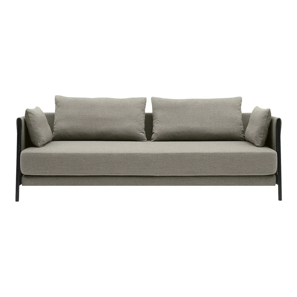 This is a young, uncomplicated sofa bed with a casual feeling for sitting, chilling and sleeping. The sofa exudes a casual elegance with its pure fabric-covered steel armrests and the many back cushions with pointed seams. The fabric-covered steel armrests give it its identity and uniqueness. The seat depth of the MADISON sofa invites you to lounge and chill. The pillows, which can be freely arranged, are sometimes used as an armrest, for lumbar support or as a backrest, and there is plenty of space for your personal favorite pillow too. The upper seat cushion can easily be folded forward, and the bed is created.