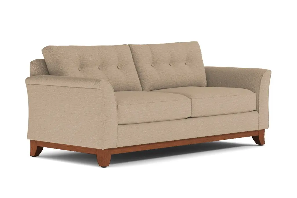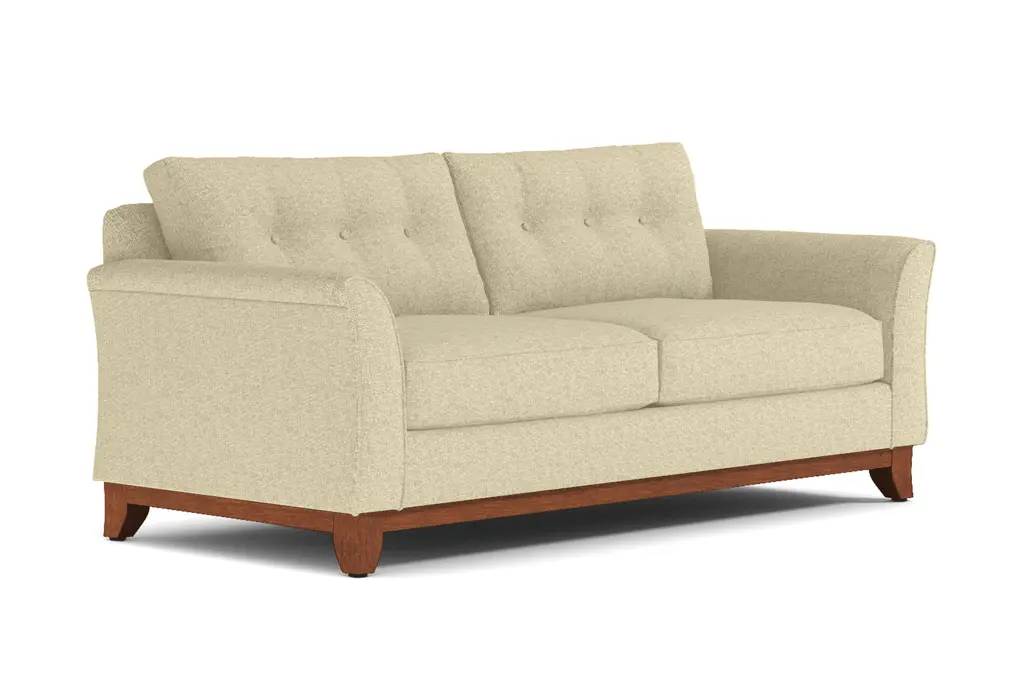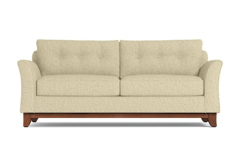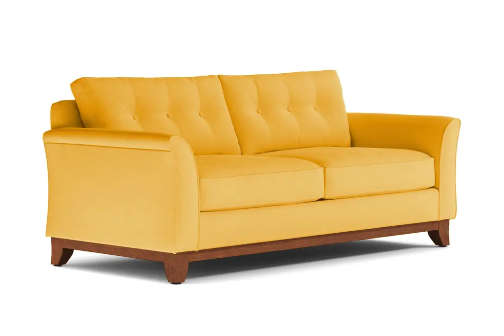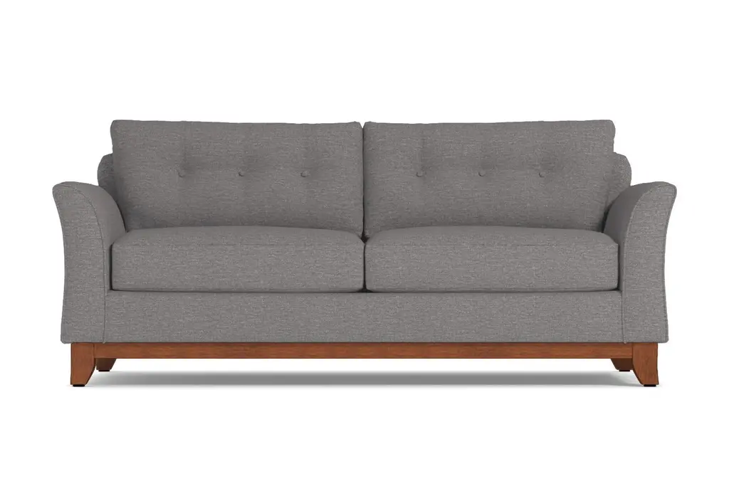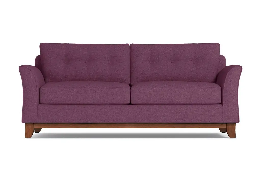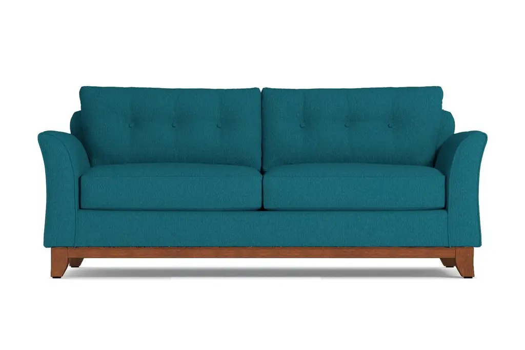 Modern meets classic royalty in this incredibly stylish and totally customizable Marco sleeper sofa bed. The regal look starts with tufted buttons on the back cushions and a beautifully stained wood base. But this throne has a special surprise inside. Open it up and you'll have a queen-size mattress fit for even the most distinguished guests. After all, you can't expect royalty to sleep on your old air mattress. Trust us - with one of these mattresses, they'll definitely feel like they're getting the royal treatment. This comfortable sleeper sofa bed makes it easy to add sleek style to your space while also turning any area into an instant guest room. Customize your couch by choosing from our selection of fabrics in rich, beautiful colors and our variety of leg finish options. You can also choose whether your sofa includes a classically cozy innerspring or a luxurious memory foam mattress. This sleeper sofa bed is made in the USA and comes with a limited lifetime warranty.