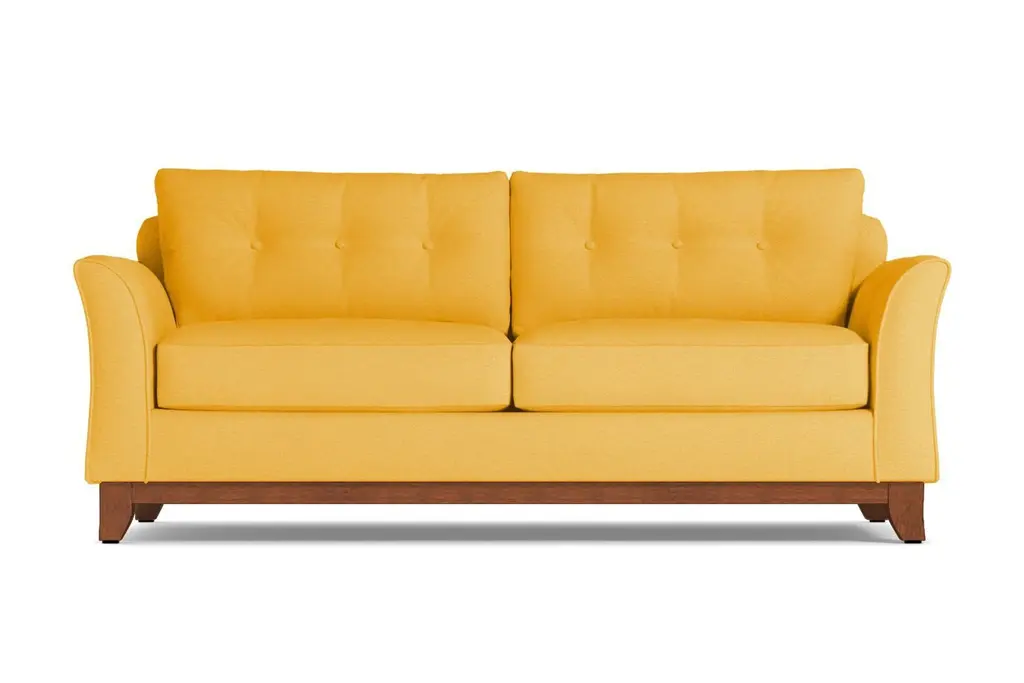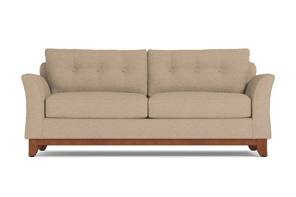 Modern meets classic royalty in this incredibly stylish and totally customizable Marco sleeper sofa bed. The regal look starts with tufted buttons on the back cushions and a beautifully stained wood base. But this throne has a special surprise inside. Open it up and you'll have a queen-size mattress fit for even the most distinguished guests. After all, you can't expect royalty to sleep on your old air mattress. Trust us - with one of these mattresses, they'll definitely feel like they're getting the royal treatment. This comfortable sleeper sofa bed makes it easy to add sleek style to your space while also turning any area into an instant guest room. Customize your couch by choosing from our selection of fabrics in rich, beautiful colors and our variety of leg finish options. You can also choose whether your sofa includes a classically cozy innerspring or a luxurious memory foam mattress. This sleeper sofa bed is made in the USA and comes with a limited lifetime warranty.