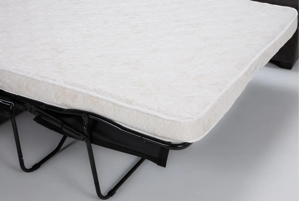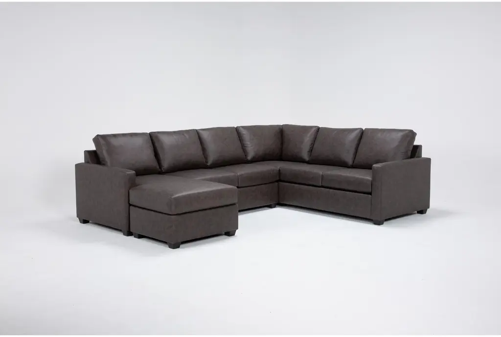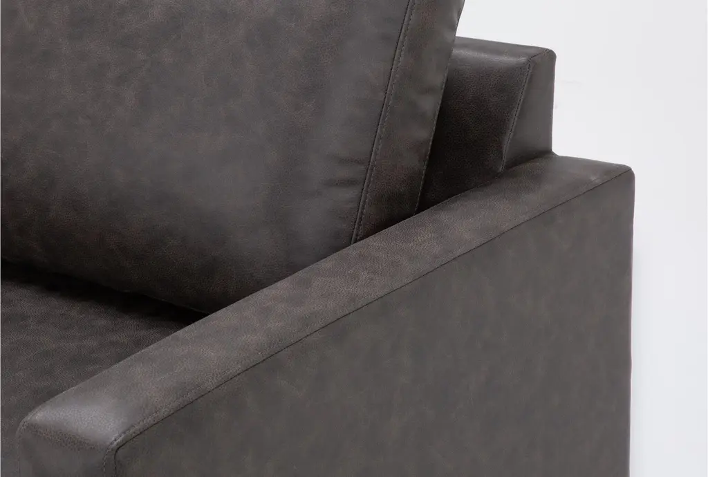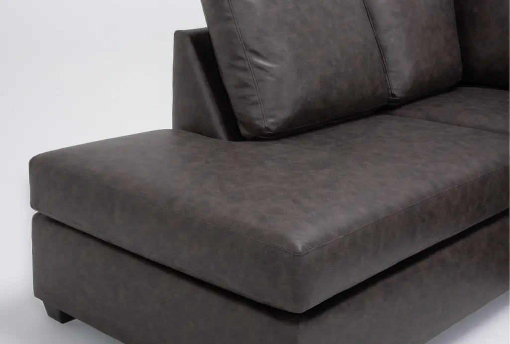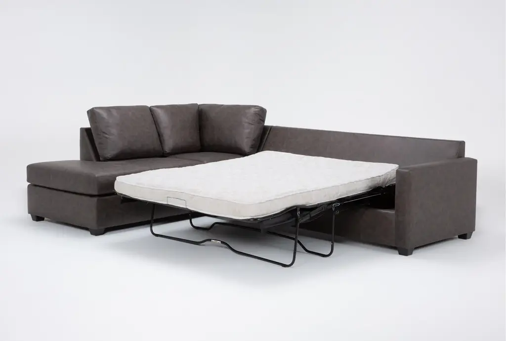 The Mathers Grey Brown Vegan Faux Leather 2 Piece Sectional with Right Arm Facing Sleeper Sofa Chaise and Left Arm Facing Corner Chaise & Ottoman is the perfect addition to your living room. This modern sectional offers comfort and functionality with its sleeper design and spacious seating. The grey brown faux leather upholstery provides a sophisticated look while being easy to maintain.