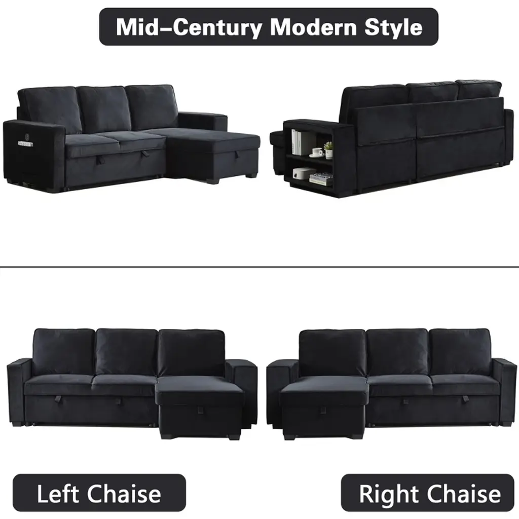 Mid-century Modern Velvet Sofa Sectional L-shaped Sofa Pull Out Sofabed Convertible Sleeper Sofa Bed With Storage Chaise & Usb For Living Room