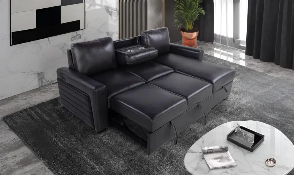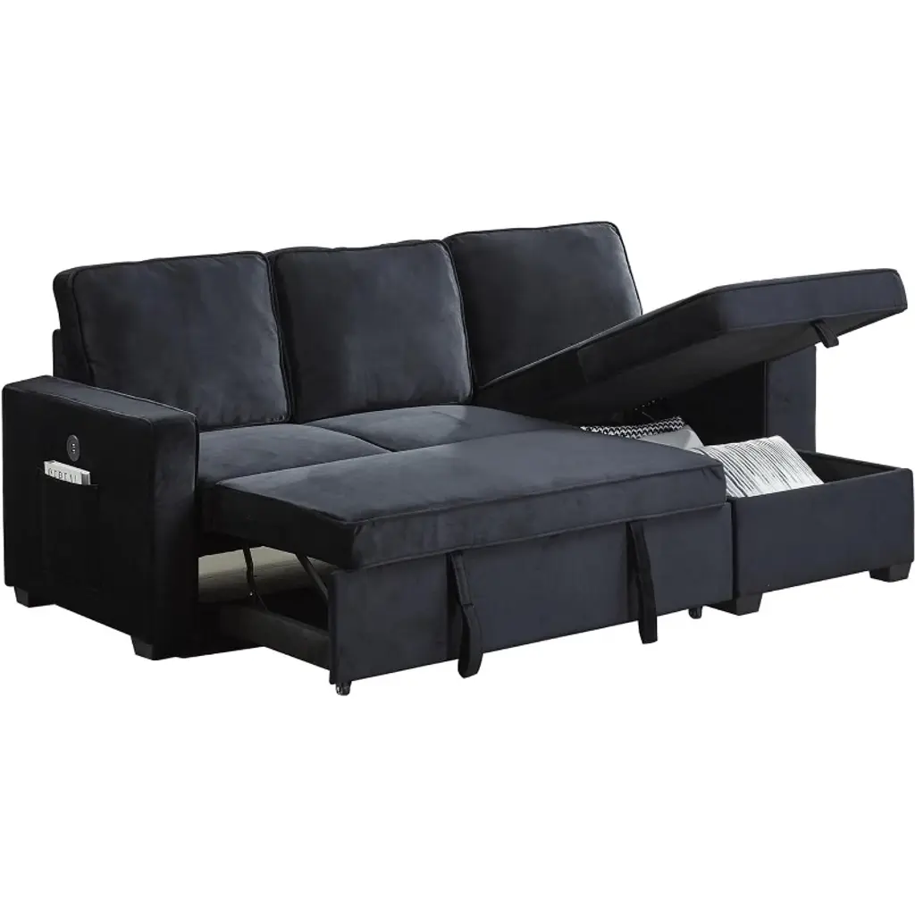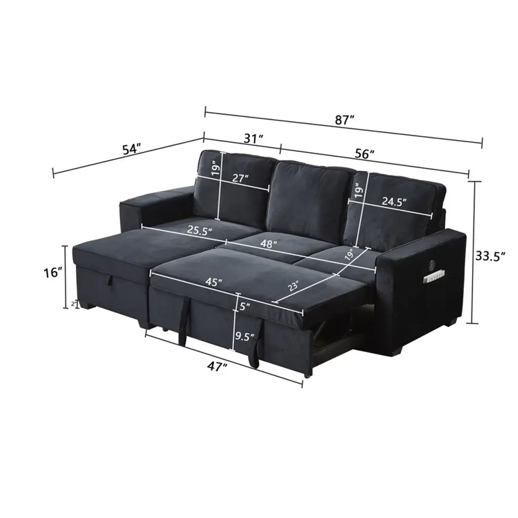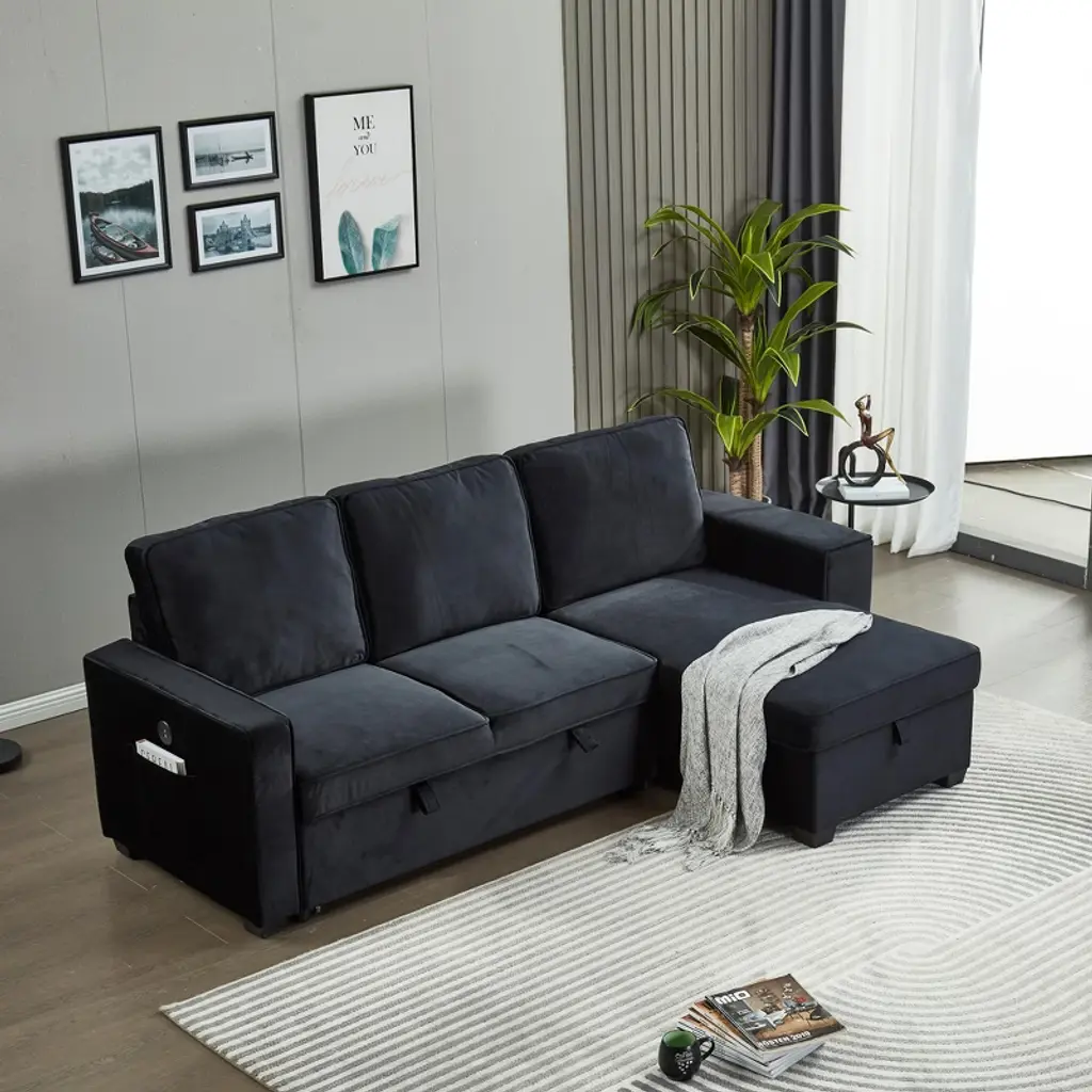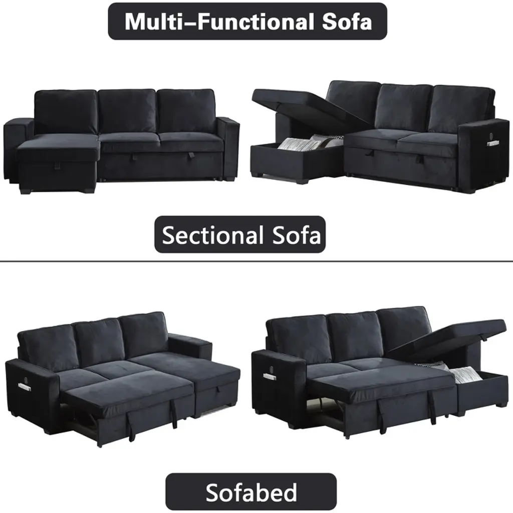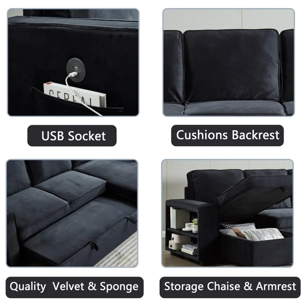 Modern L-Shape Sectional Sofa: This convertible sofa is a great addition to your living room, providing ample seating space for your family and friends. The chaise can be placed on either side to suit your needs Comfortable & Sturdy Couch: The sofa is made of high-quality velvet fabric, filled with high-density foam, and supported by a sturdy wooden frame. The velvet is soft to the touch and has a beautiful texture, making it comfortable to sit on and perfect for relaxing Pull-out Sofabed: The sofa bed features a pull-out mechanism that allows you to easily convert it into a bed. The bed is spacious and comfortable, perfect for guests or overnight stays Multifunction Sofa bed: This sofa has a USB charging port on the side, making it convenient to charge your devices while you relax. Both Chaise and one side armrest have storage space£¬keeping your space tidy