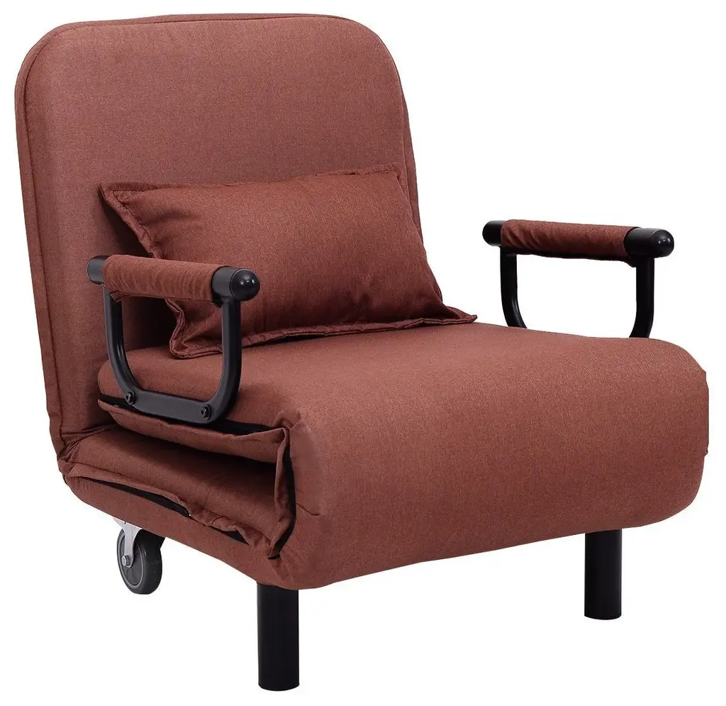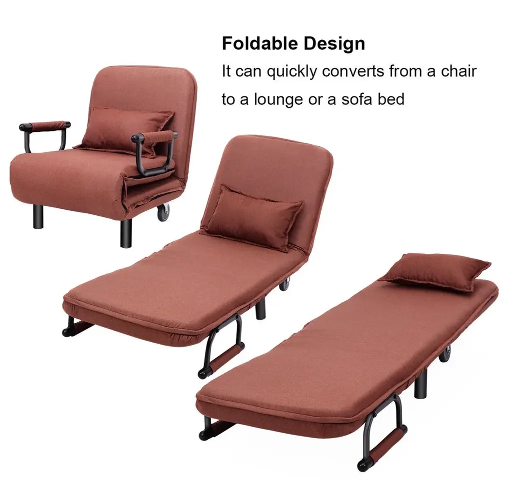 This convertible 3-in-1 sofa bed is a perfect addition to any household that wants comfort and convenience without giving up a ton of space. The unique folding design makes this sofa easy to transform. It has multiple positions, such as a sofa, a chaise lounge or a bed. Featuring steel construction, this sofa can retain its value over the long term. It comes with a pillow as a gift. You can put it in the living room, bedroom, or even in the office.Brand new and high qualityConstructed of high-quality polyester, sponge and steel, provides lasting durabilityFolds up to a sofa, bed or chaise loungeEquipped with two casters for easier mobilityFive adjustable positions of the backrestFeet can be hidden in the backrestFilled with a thick sponge for superior comfortIncludes soft pillow for added comfortThe outer cover can be removed for easy cleanIdeal for sleeping, lounging, rest, entertainment, relaxation, etc.Assembly requiredColor: Blue/CoffeeMaterial: Polyester + steel + spongeOverall dimension: 26.5" x 39" x 31" (W x D x H)Seat size: 25.5" x 23" (W x D)Height from seat to ground: 15.5"Back size: 25.5" x 16"Weight capacity: 330 lbsPackage includes:1 xSofa bed