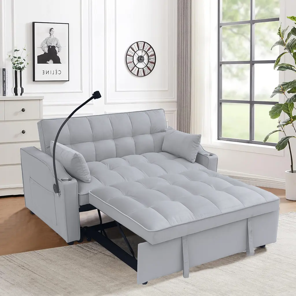 Modern Convertible Sleeper Sofa Bed Velvet Loveseat Futon Sofa Couch With Reclining Backrest Pull Out Bed And Lounge Sofa - Light Gray