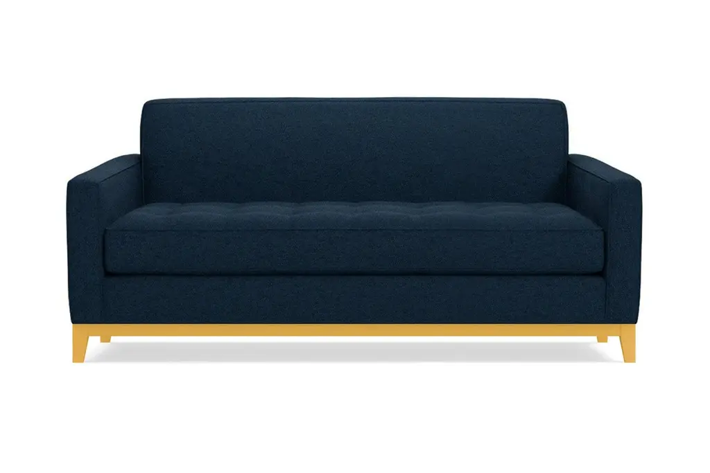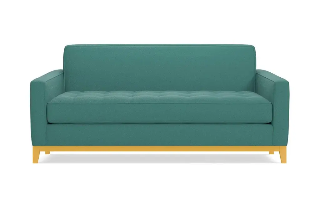 The Monroe Drive Collection is a modern update of our show-stopping Monroe Collection. The same eye-catching Mid Century Modern design details that defined the Monroe are still on display, but now with the addition of a stunning, solid wood base and a Full-Sized pull-out sleeper mattress! The sophisticated button-tufted cushions and sleek tight back make the Monroe Drive look like it came straight from a classic Hollywood film set. The contemporary base creates a handsome, formal profile that allows the Monroe Drive to feel right at home in a variety of different decor styles. Available in your custom choice of our kid friendly and pet friendly fabrics, the Monroe Drive is perfect for your family home, for your sophisticated apartment, or for your chic small space loft. The Monroe Drive Apartment Size sleeper sofa bed features a Full-Sized Deluxe Innerspring Mattress or an upgraded Memory Foam Mattress. This makes the Monroe Drive one of the most visually-appealing and versatile sofa beds around. It also comes with a limited lifetime warranty and free delivery!
