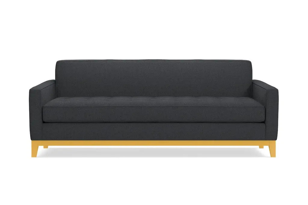 The Monroe Drive Collection is a modern update of our show-stopping Monroe Collection. The same eye-catching Mid Century Modern design details that defined the Monroe are still on display, but now with the addition of a stunning, solid wood base and a Queen-Sized pull-out sleeper mattress! The sophisticated button-tufted cushions and sleek tight back make The Monroe Drive look like it came straight from a classic Hollywood film set. The contemporary base creates a handsome, formal profile that allows the Monroe Drive to feel right at home in a variety of different decor styles. Available in your custom choice of our kid friendly and pet friendly fabrics, the Monroe Drive is perfect for your family home, for your sophisticated apartment, or for your chic small space loft. The Monroe Drive Queen Size sleeper sofa bed features a Queen-Sized Deluxe Innerspring Mattress or an upgraded Memory Foam Mattress. This makes the Monroe Drive one of the most visually-appealing and versatile sofa beds around. It also comes with a limited lifetime warranty and free delivery!