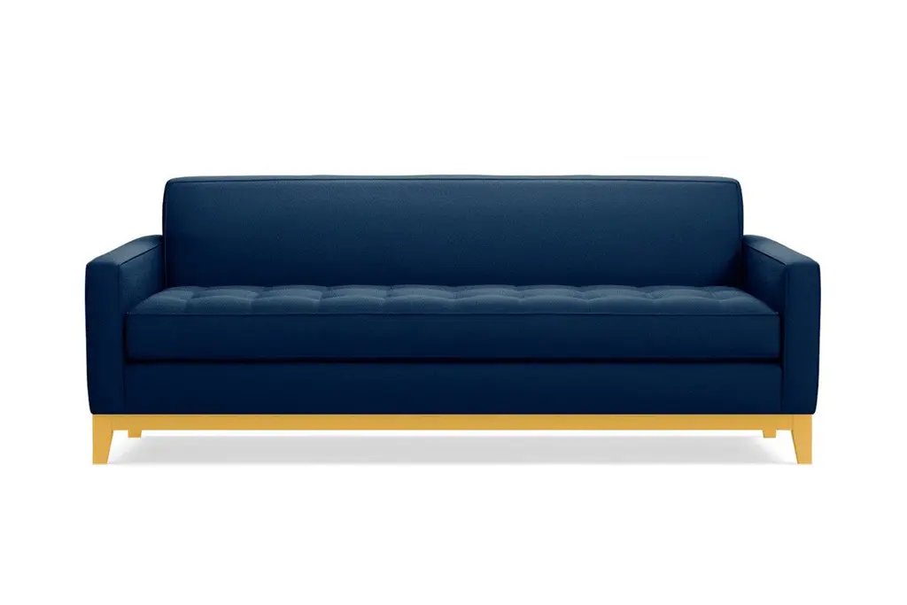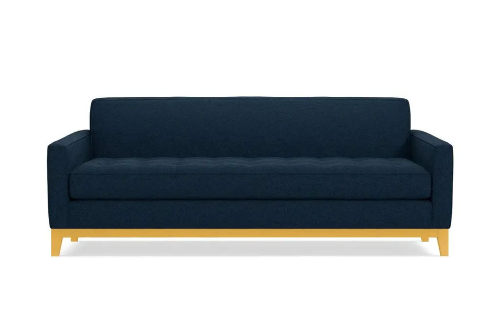 The Monroe Drive Collection is a modern update of our show-stopping Monroe Collection. The same eye-catching Mid Century Modern design details that defined the Monroe are still on display, but now with the addition of a stunning, solid wood base and a Queen-Sized pull-out sleeper mattress! The sophisticated button-tufted cushions and sleek tight back make The Monroe Drive look like it came straight from a classic Hollywood film set. The contemporary base creates a handsome, formal profile that allows the Monroe Drive to feel right at home in a variety of different decor styles. Available in your custom choice of our kid friendly and pet friendly fabrics, the Monroe Drive is perfect for your family home, for your sophisticated apartment, or for your chic small space loft. The Monroe Drive Queen Size sleeper sofa bed features a Queen-Sized Deluxe Innerspring Mattress or an upgraded Memory Foam Mattress. This makes the Monroe Drive one of the most visually-appealing and versatile sofa beds around. It also comes with a limited lifetime warranty and free delivery!