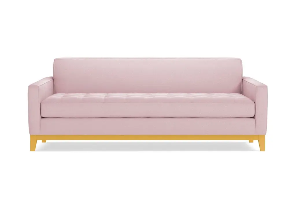 The Monroe Drive Collection is a modern update of our show-stopping Monroe Collection. The same eye-catching Mid Century Modern design details that defined the Monroe are still on display, but now with the addition of a stunning, solid wood base and a Queen-Sized pull-out sleeper mattress! The sophisticated button-tufted cushions and sleek tight back make The Monroe Drive look like it came straight from a classic Hollywood film set. The contemporary base creates a handsome, formal profile that allows the Monroe Drive to feel right at home in a variety of different decor styles. Available in your custom choice of our kid friendly and pet friendly fabrics, the Monroe Drive is perfect for your family home, for your sophisticated apartment, or for your chic small space loft. The Monroe Drive Queen Size sleeper sofa bed features a Queen-Sized Deluxe Innerspring Mattress or an upgraded Memory Foam Mattress. This makes the Monroe Drive one of the most visually-appealing and versatile sofa beds around. It also comes with a limited lifetime warranty and free delivery!