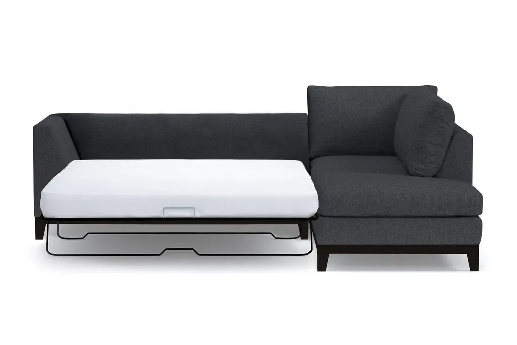 The Mulholland Drive 2-Piece Velvet Sleeper Sofa Sectional adds Old Hollywood glamour to your home. With clean lines and sumptuous velvet upholstery, this sectional sleeper takes midcentury modern design to a completely new level. Nothing says luxury like velvet. Choose your favorite shade from a variety of hues to create a pop of bright color or integrate with neutral décor. Either way, we’ll send you up to 10 free velvet fabric swatches so you can see what works and feel the luscious texture (and P.S. our velvets are kid- and pet-friendly!). Customize your Mulholland Drive velvet sectional sleeper with your choice of leg finish and a right- or left-side chaise. You also have a choice for the full-size pull-out mattress on a sturdy easy-fold mechanism: standard Deluxe Innerspring or Memory Foam for the ultimate upgrade. Our 2-piece velvet sleeper sofa sectional is custom made in our Los Angeles facility with a solid wood frame, 2.0-density foam seat cushions, a limited lifetime warranty on the frame and workmanship, and free shipping right to your door.