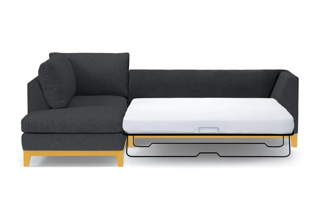 The Mulholland Drive 2-Piece Velvet Sleeper Sofa Sectional adds Old Hollywood glamour to your home. With clean lines and sumptuous velvet upholstery, this sectional sleeper takes midcentury modern design to a completely new level. Nothing says luxury like velvet. Choose your favorite shade from a variety of hues to create a pop of bright color or integrate with neutral décor. Either way, we’ll send you up to 10 free velvet fabric swatches so you can see what works and feel the luscious texture (and P.S. our velvets are kid- and pet-friendly!). Customize your Mulholland Drive velvet sectional sleeper with your choice of leg finish and a right- or left-side chaise. You also have a choice for the full-size pull-out mattress on a sturdy easy-fold mechanism: standard Deluxe Innerspring or Memory Foam for the ultimate upgrade. Our 2-piece velvet sleeper sofa sectional is custom made in our Los Angeles facility with a solid wood frame, 2.0-density foam seat cushions, a limited lifetime warranty on the frame and workmanship, and free shipping right to your door.