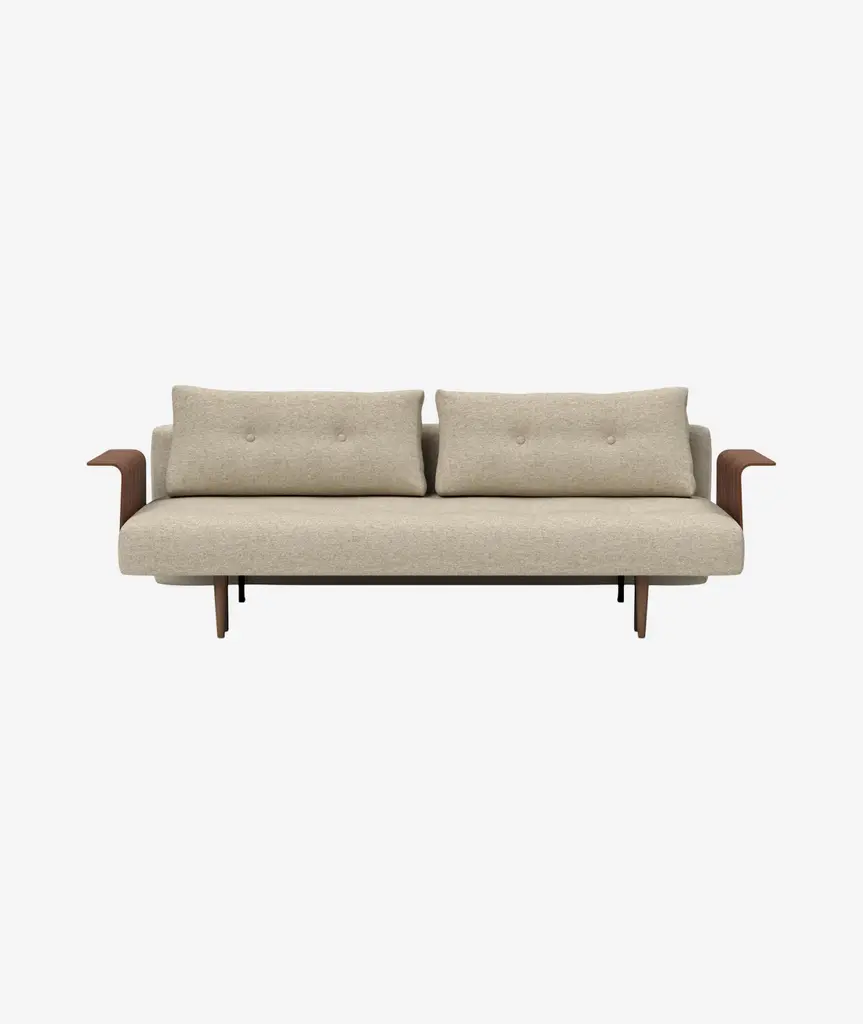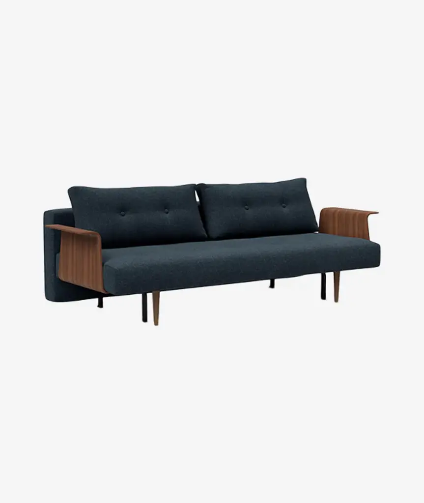 The Recast is a design influenced by the American Mid-Century Modern movement evident through its clean simplicity fused with warm wooden materials exemplified in the Styletto legs and armrests. The simplicity of the design and voluptuousness of the cushions is underscored by the integrated buttons. A subtle comment on the sofa's desire for simple comfort. Remove the cushions and you have a single bed. Slide out the seat, flip down the backrest and you have a double. Perfect for small living.