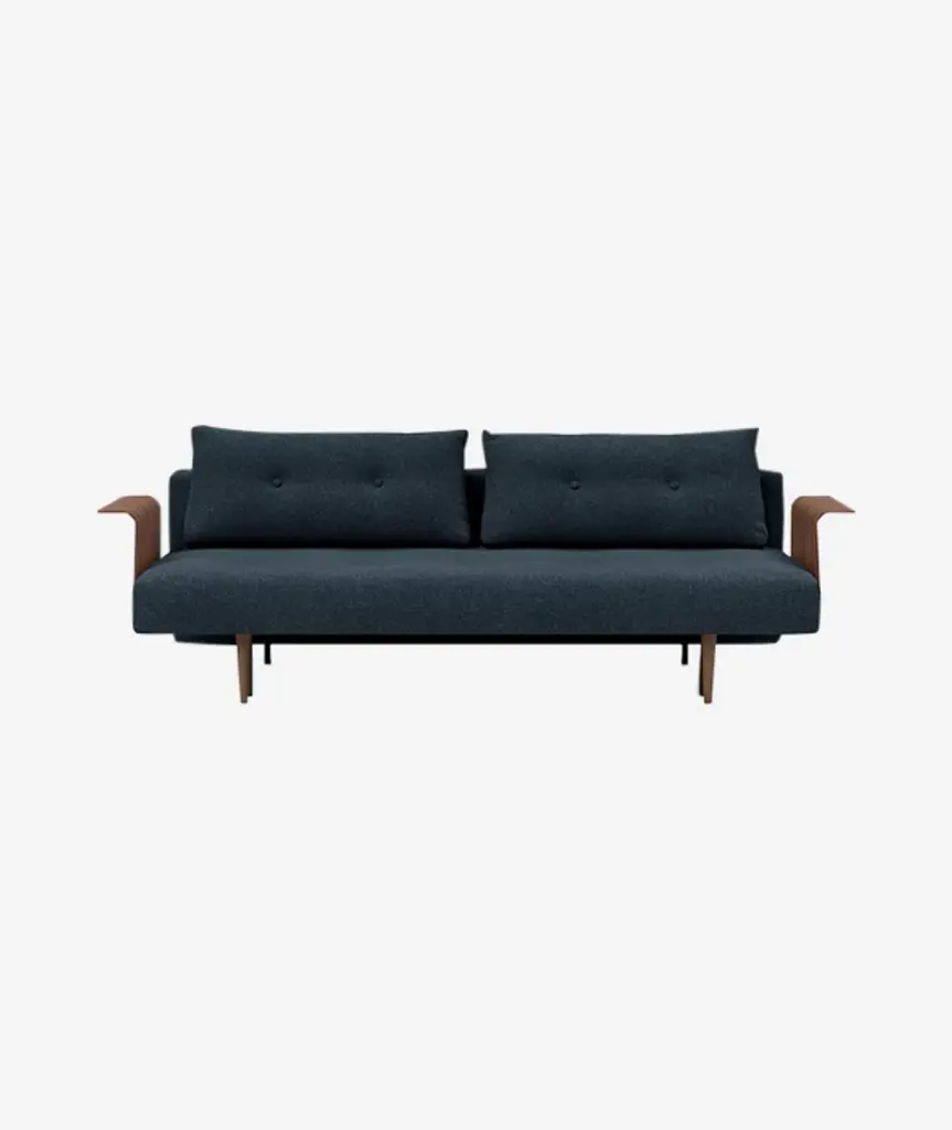 The Recast is a design influenced by the American Mid-Century Modern movement evident through its clean simplicity fused with warm wooden materials exemplified in the Styletto legs and armrests. The simplicity of the design and voluptuousness of the cushions is underscored by the integrated buttons. A subtle comment on the sofa's desire for simple comfort. Remove the cushions and you have a single bed. Slide out the seat, flip down the backrest and you have a double. Perfect for small living.