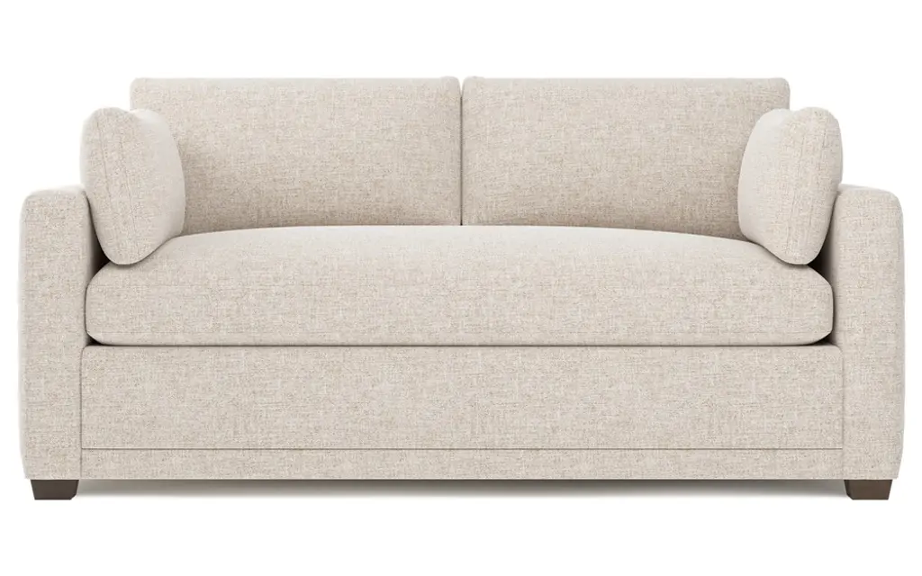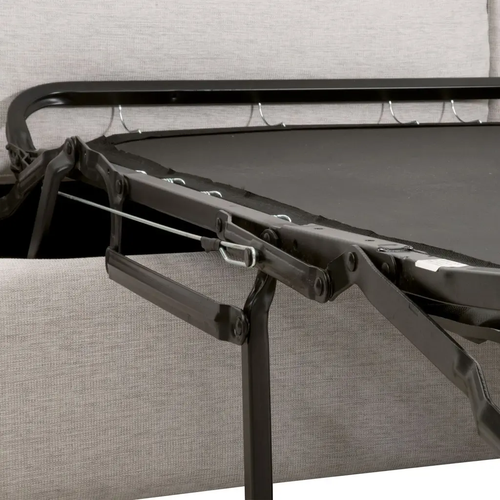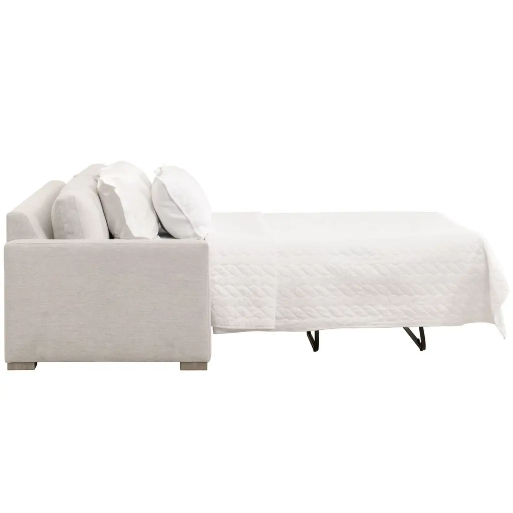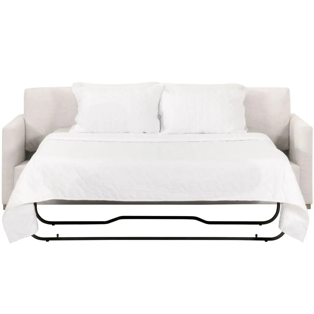 This transitional sleeper sofa is functional and durable. With its soft colors and simple design, this sofa is warm and inviting with a casual look and feel. It features one bench seat cushion and two throw pillows filled with 100% down. It is upholstered with a stain-resistant fabric for easy cleaning. The fabric is a perfect weave of light gray and white threading with a slightly textured look and feel. A pull-out bed is nicely tucked within the sofa and can be pulled out whenever an extra sleeping space in desired. The bed holds a queen-sized mattress that is sold separately.