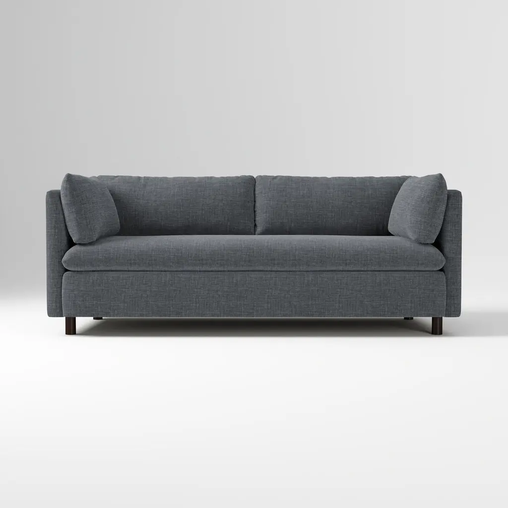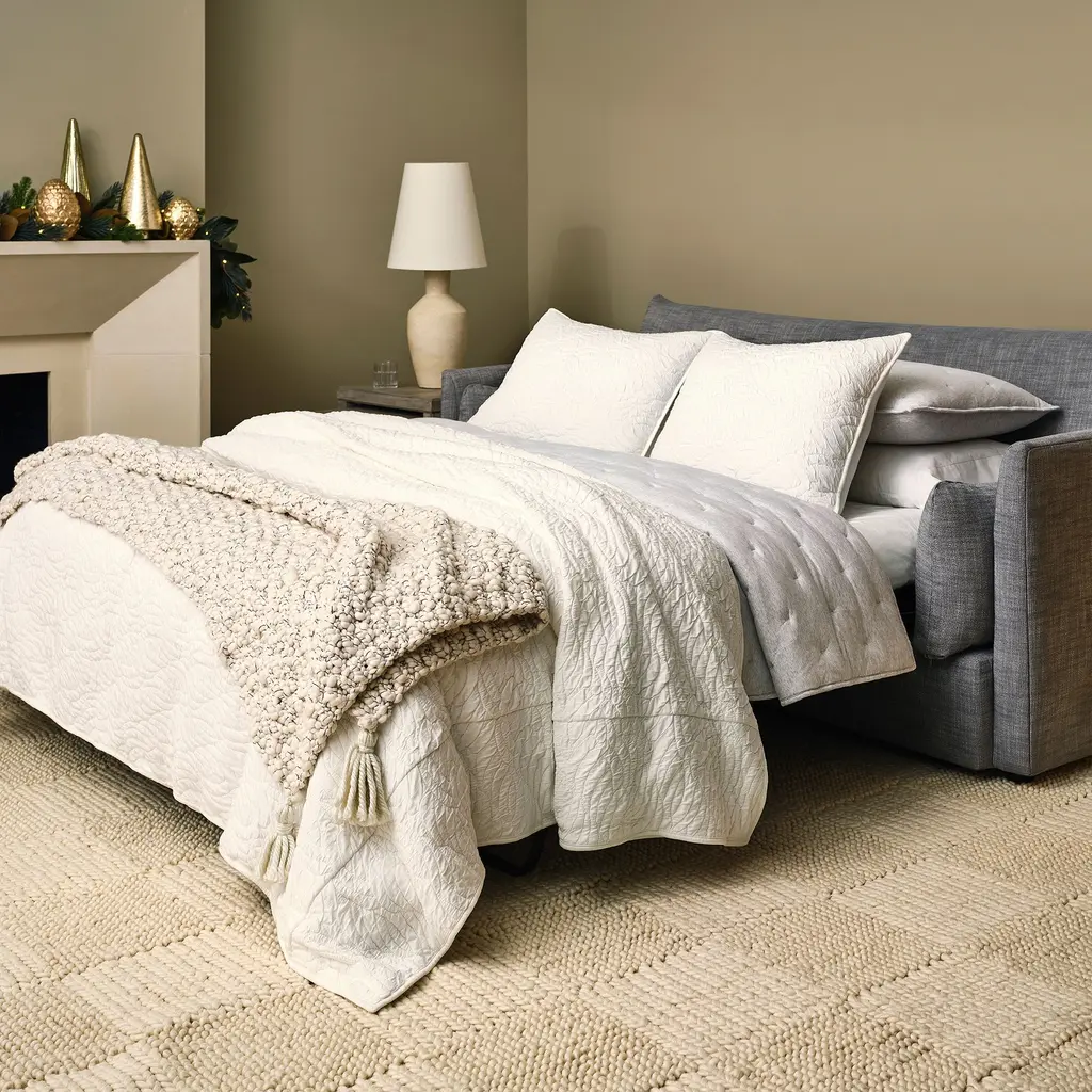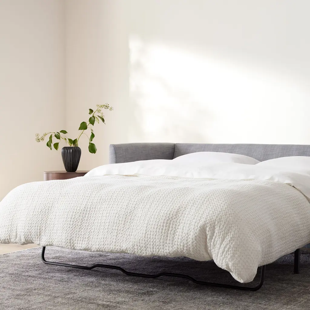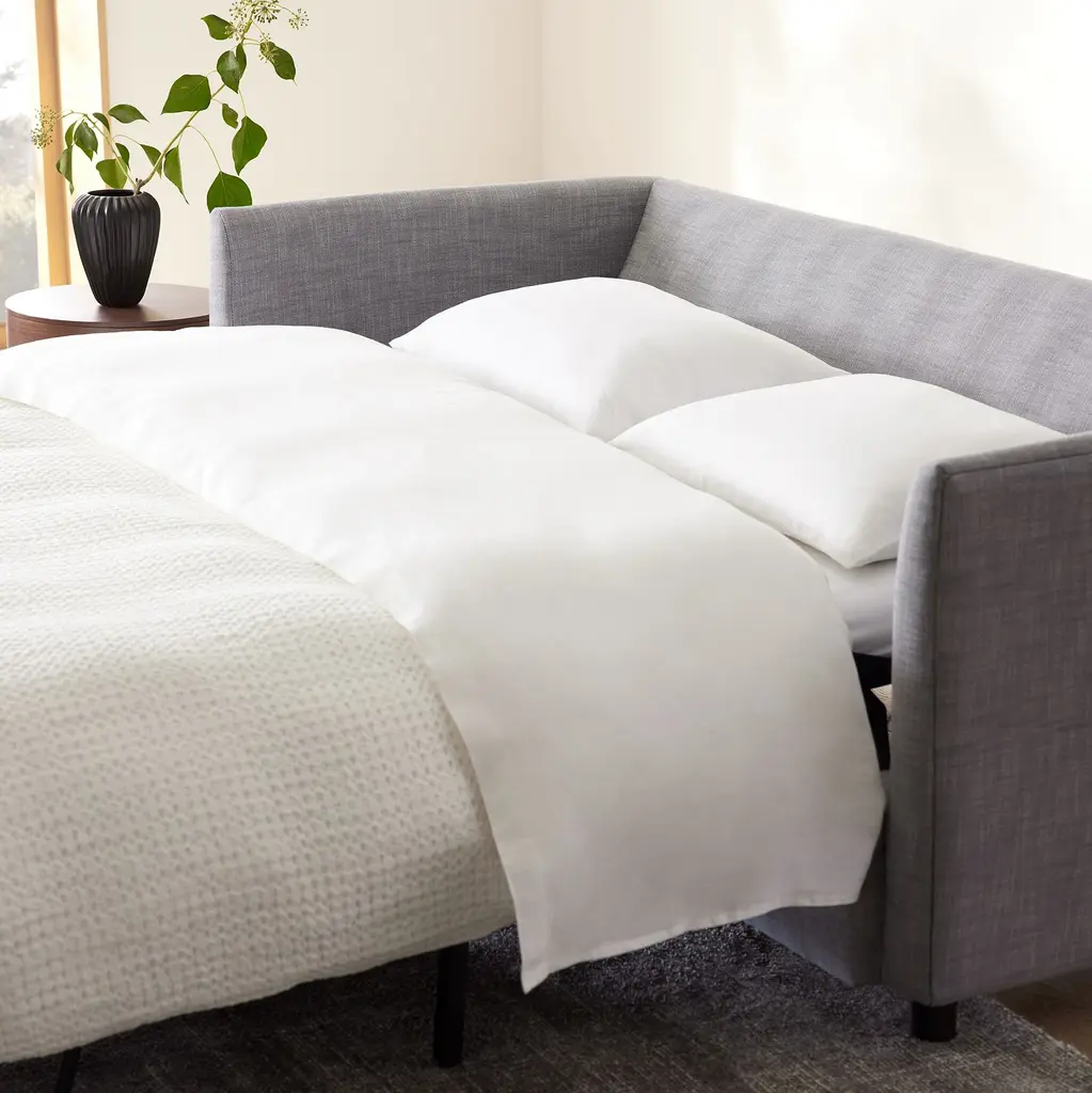 Cocoon-like sofa by day, handy sleeper by night. Pull-out mattress has a memory foam top. Frame is piled with plush cushions on all sides. Hand-built frames with hand-finished upholstery.