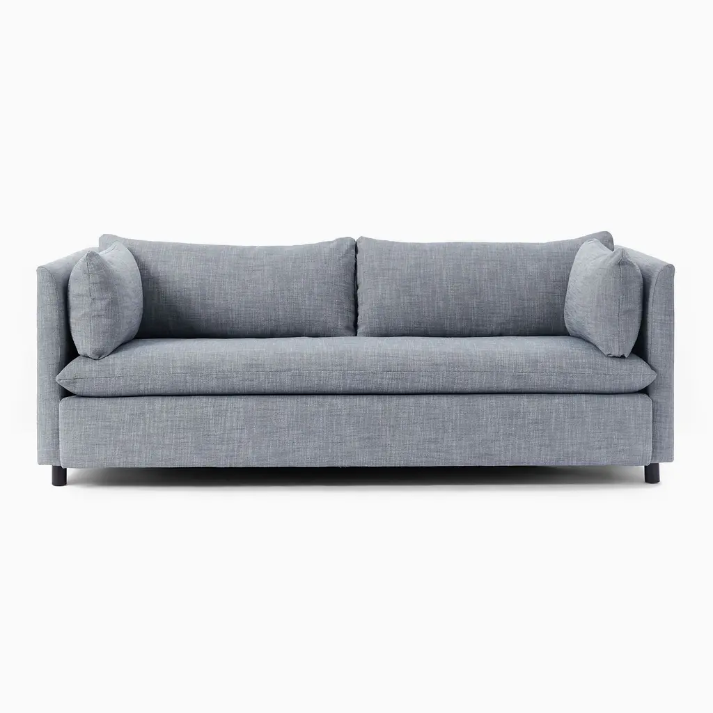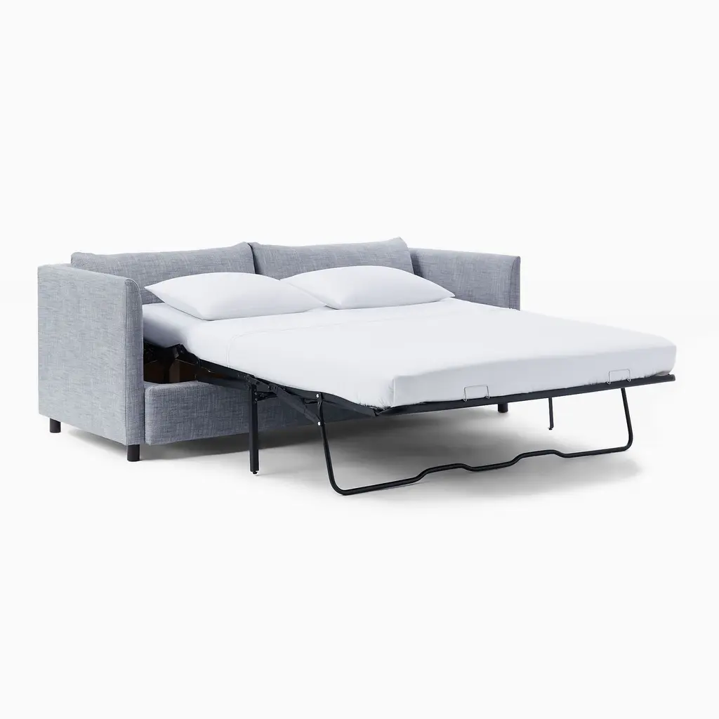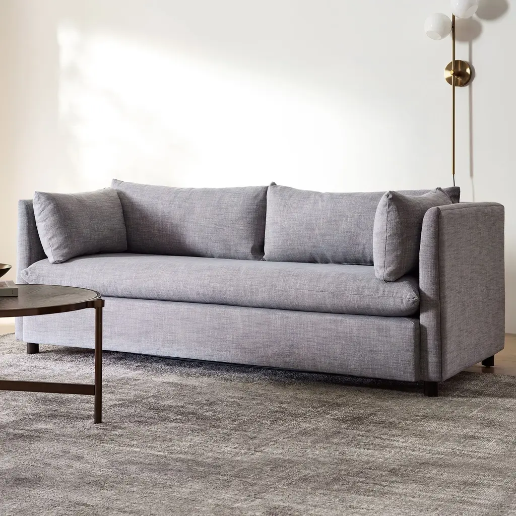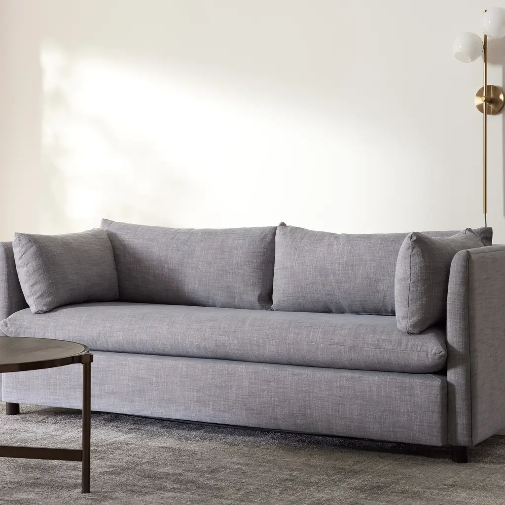 Cocoon-like sofa by day, handy sleeper by night. Pull-out mattress has a memory foam top. Frame is piled with plush cushions on all sides. Hand-built frames with hand-finished upholstery.