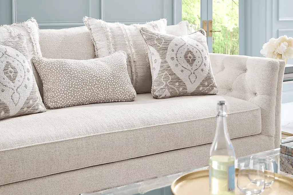 The classic charm and modern refinement of a Hamptons retreat come to life in the Shelton collection from Cindy Crawford Home, where plush textures, refined details, and effortless elegance offers an invitation to cosmopolitan coziness. Upholstered in a soft ivory chenille, this traditional sofa features stylish tuxedo arms and deep tufting for a luxurious touch. The cloud-like seat cushion makes for indulgent relaxation, while complementing accent pillows add extra comfort and sophistication. Hidden beneath the sofa's cushion is a queen Sealy Royale sleeper mattress that easily transforms your living room into a comfortable sleeping space for overnight guests. Tall, tapered legs in a dark finish offer a perfect finishing contrast for the piece. Upholstery: 100% Polyester. Cleaning Instructions: Use water-based cleaning agents or foam.