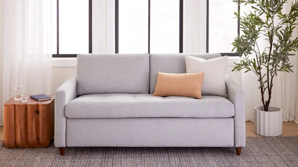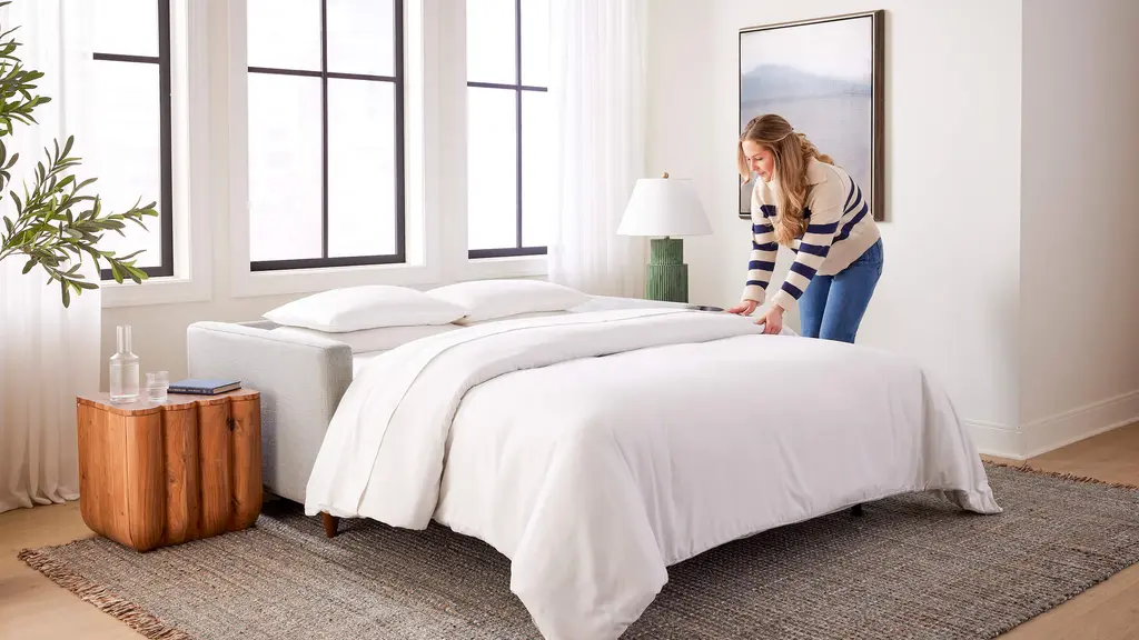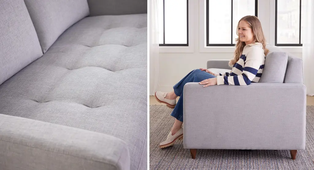 DESIGN Meet the MCM collection: a laid-back spin on classic mid-century modern design. Iconic details like clean clines, solid wood legs and elegant tufting meet a softer, more relaxed loose-back cushion. The result? A look that's effortlessly cool and incredibly comfortable. This sofa bed doubles as an instant guest space, unfolding into a luxe bed with all the comforts of home (no bars or springs here!). Handcrafted in the USA. FEATURES Solid Foundation: Our frames are constructed from precision-cut, FSC-certified engineered wood for unmatched strength and stability, featuring reinforced, interlocking joinery for added durability. Customizable Cushion Options: Choose from standard or down alternative cushions. Standard cushions are made from high-quality, high-resiliency CertiPUR-US® foam wrapped in premium fiber, giving you a supportive, comfortable sit and a sleek look that's low maintenance. Down alternative cushions feature a back cushion that's filled with 100% premium fiber and a bench seat cushion with a high-quality, high-resiliency CertiPUR-US® foam core wrapped in down-alternative fiber. Down alternative cushions give you sink-in comfort with a supportive sit & a relaxed look. Regular fluffing keeps your piece looking perfect. CertiPur-US® foam is held to the highest standards of product safety and durability, so you can rest easy. Next-Level Sleeping Comfort: No springs or bars to keep you up at night - just a 5" premium, high-density mattress crafted from 3 layers of high-resiliency foam for an amazing night of sleep. Customizable Upholstery: Choose from a vast selection of durable premium and performance fabrics and genuine Italian leather to personalize your MCM Sofa Bed.