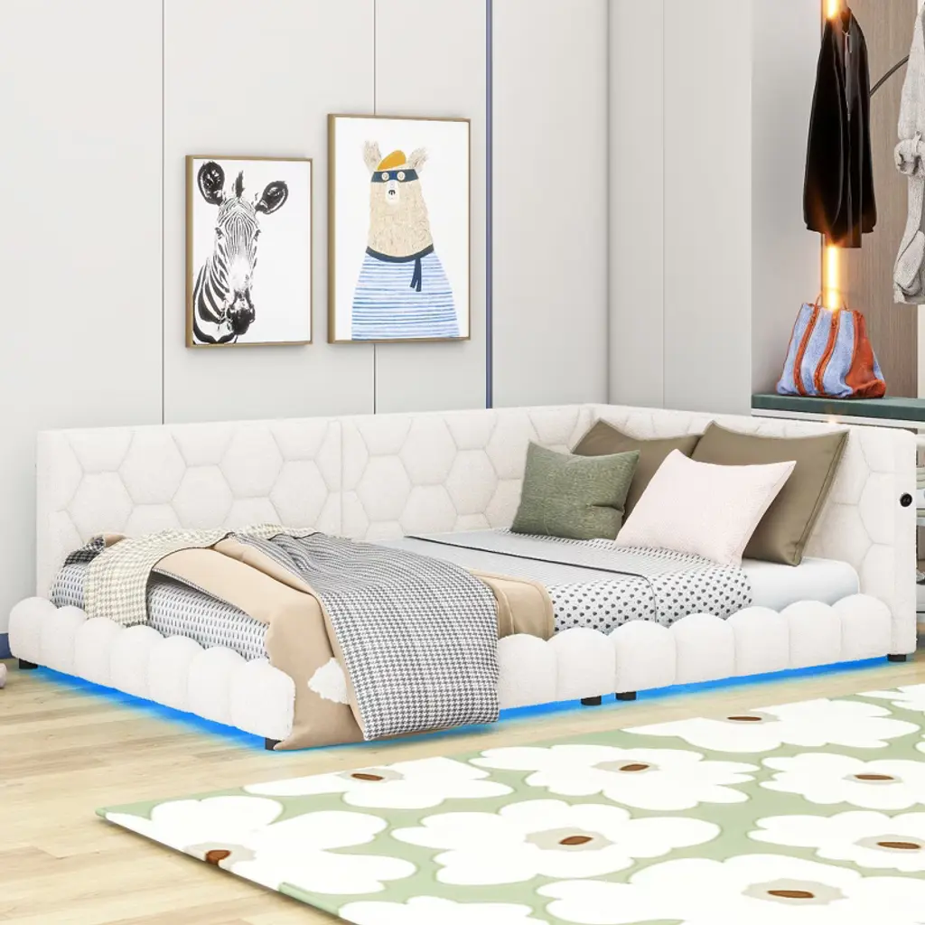 Tiramisubest Upholstered Full Size Daybed With Usb Ports And Led Belt, L-shaped Daybed Frame Sofa Bed With Support Legs And Slats