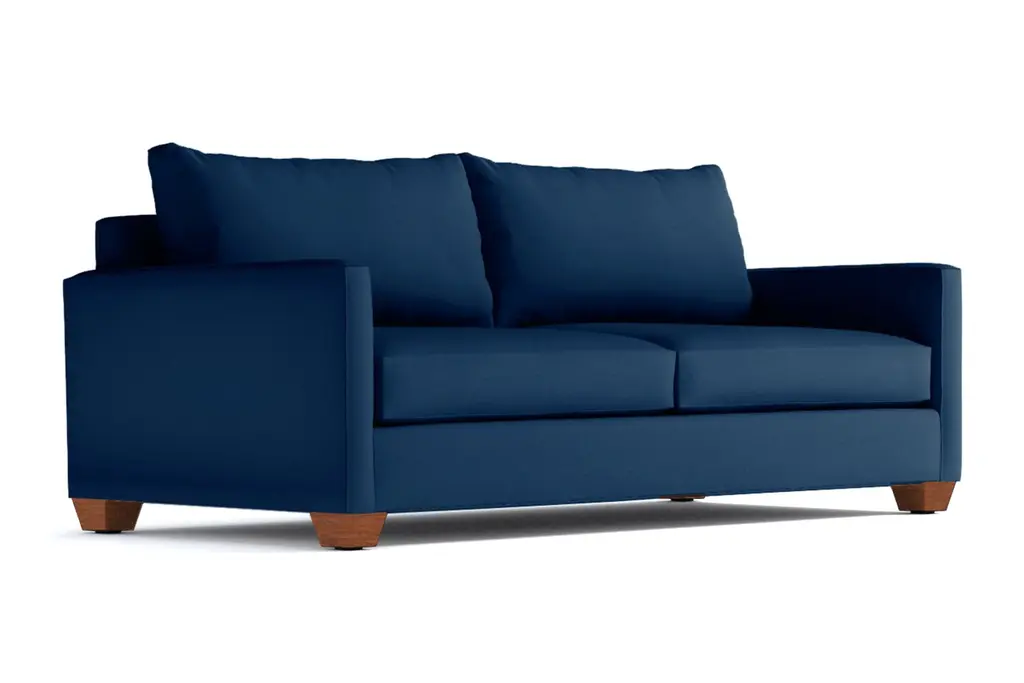 Tuxedo Queen Sleeper Sofa – Custom Made in the USA – The Tuxedo Sleeper Sofa (87"w x 39"d x 36"h) blends timeless style with practical comfort, featuring eco-friendly construction, a solid wood frame, and plush reversible cushions. Upholstered in cleanable, hypoallergenic fabrics with zippered, removable covers, it’s designed for both everyday use and long-term durability. The sofa unfolds easily into a queen-size bed with a 5.5" thick innerspring mattress (60"w x 72"d), supported by a smooth steel mechanism. Seat dimensions measure 25"d x 18"h, with arms 4.5"w x 25"h, and a 27" doorway clearance (with legs removed) ensures easy delivery. Custom fabric colors and leg finishes are available, making the Tuxedo as versatile as it is comfortable. Backed by a limited lifetime warranty, with free delivery and 60-day returns from Apt2B.
