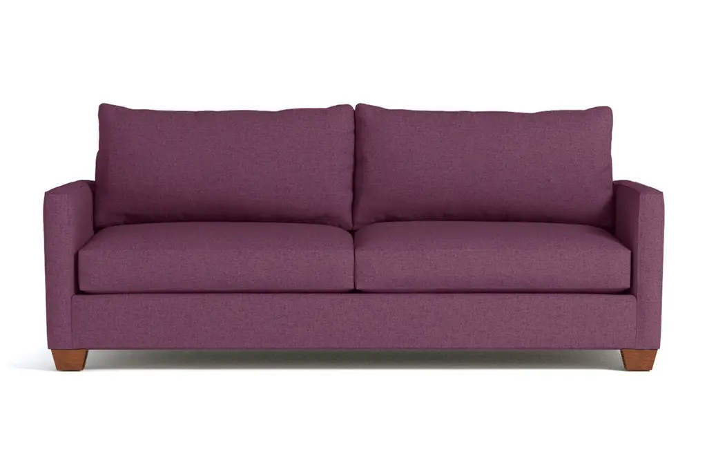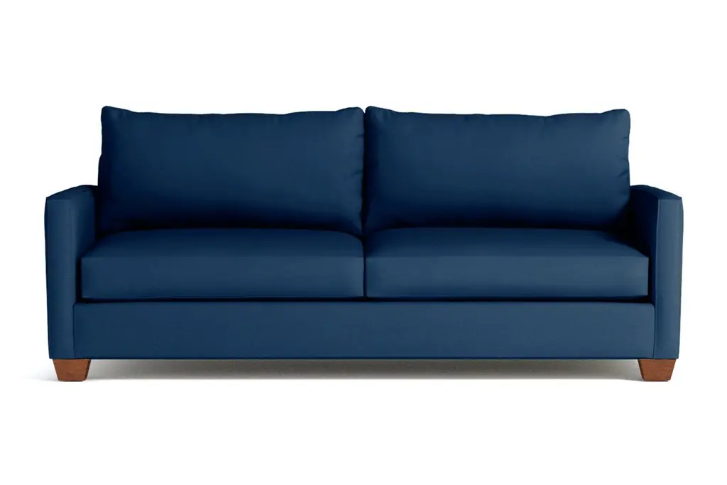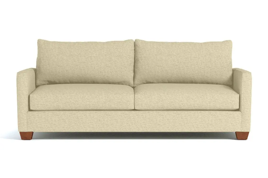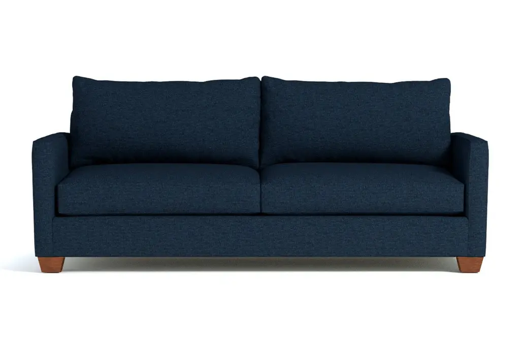 Tuxedo Queen Sleeper Sofa – Custom Made in the USA – The Tuxedo Sleeper Sofa (87"w x 39"d x 36"h) blends timeless style with practical comfort, featuring eco-friendly construction, a solid wood frame, and plush reversible cushions. Upholstered in cleanable, hypoallergenic fabrics with zippered, removable covers, it’s designed for both everyday use and long-term durability. The sofa unfolds easily into a queen-size bed with a 5.5" thick innerspring mattress (60"w x 72"d), supported by a smooth steel mechanism. Seat dimensions measure 25"d x 18"h, with arms 4.5"w x 25"h, and a 27" doorway clearance (with legs removed) ensures easy delivery. Custom fabric colors and leg finishes are available, making the Tuxedo as versatile as it is comfortable. Backed by a limited lifetime warranty, with free delivery and 60-day returns from Apt2B.