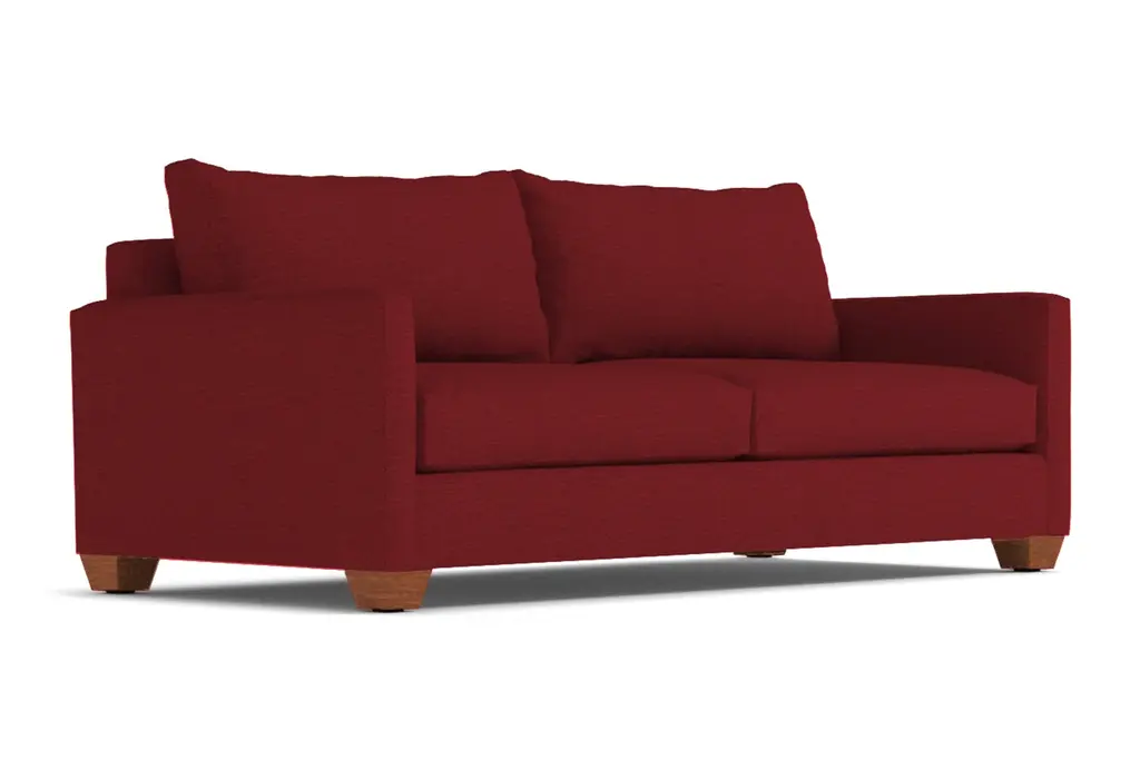 Tuxedo Queen Sleeper Sofa – Custom Made in the USA – The Tuxedo Sleeper Sofa (87"w x 39"d x 36"h) blends timeless style with practical comfort, featuring eco-friendly construction, a solid wood frame, and plush reversible cushions. Upholstered in cleanable, hypoallergenic fabrics with zippered, removable covers, it’s designed for both everyday use and long-term durability. The sofa unfolds easily into a queen-size bed with a 5.5" thick innerspring mattress (60"w x 72"d), supported by a smooth steel mechanism. Seat dimensions measure 25"d x 18"h, with arms 4.5"w x 25"h, and a 27" doorway clearance (with legs removed) ensures easy delivery. Custom fabric colors and leg finishes are available, making the Tuxedo as versatile as it is comfortable. Backed by a limited lifetime warranty, with free delivery and 60-day returns from Apt2B.