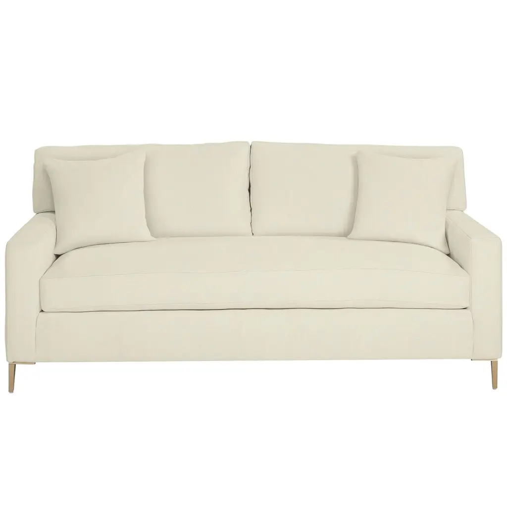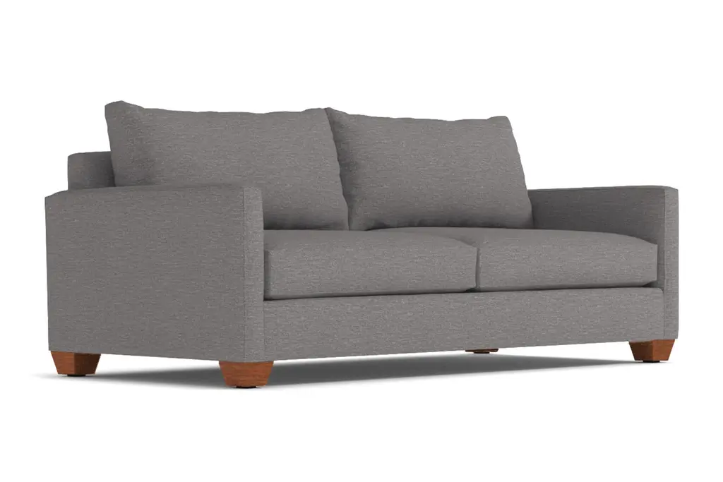 Tuxedo Queen Sleeper Sofa – Custom Made in the USA – The Tuxedo Sleeper Sofa (87"w x 39"d x 36"h) blends timeless style with practical comfort, featuring eco-friendly construction, a solid wood frame, and plush reversible cushions. Upholstered in cleanable, hypoallergenic fabrics with zippered, removable covers, it’s designed for both everyday use and long-term durability. The sofa unfolds easily into a queen-size bed with a 5.5" thick innerspring mattress (60"w x 72"d), supported by a smooth steel mechanism. Seat dimensions measure 25"d x 18"h, with arms 4.5"w x 25"h, and a 27" doorway clearance (with legs removed) ensures easy delivery. Custom fabric colors and leg finishes are available, making the Tuxedo as versatile as it is comfortable. Backed by a limited lifetime warranty, with free delivery and 60-day returns from Apt2B.