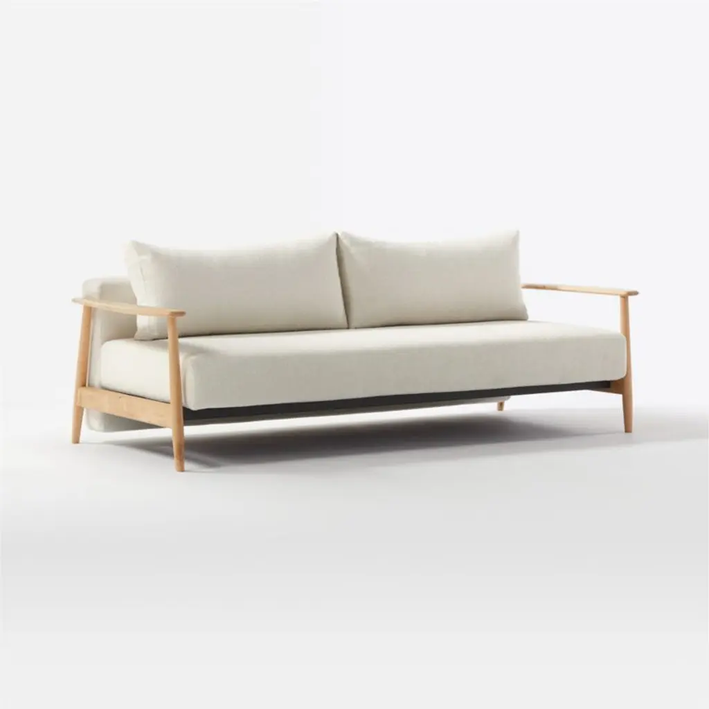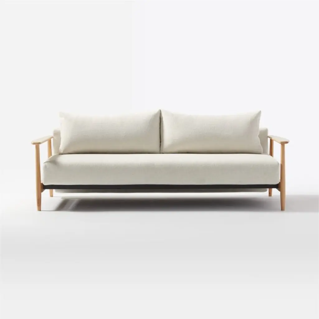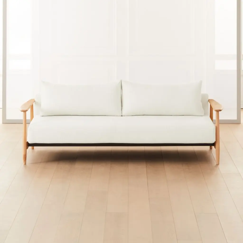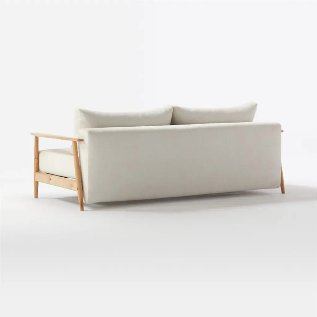 Convertible sleeper sofa gets a stylish update in luxe, ivory boucle upholstery. By day, it's a comfy lounge for TV/reading/etc. At night, flip the back all the way down and voilà…a worthy platform bed with real pocketed coil mattress innersprings that sleeps two. CB2 exclusive.